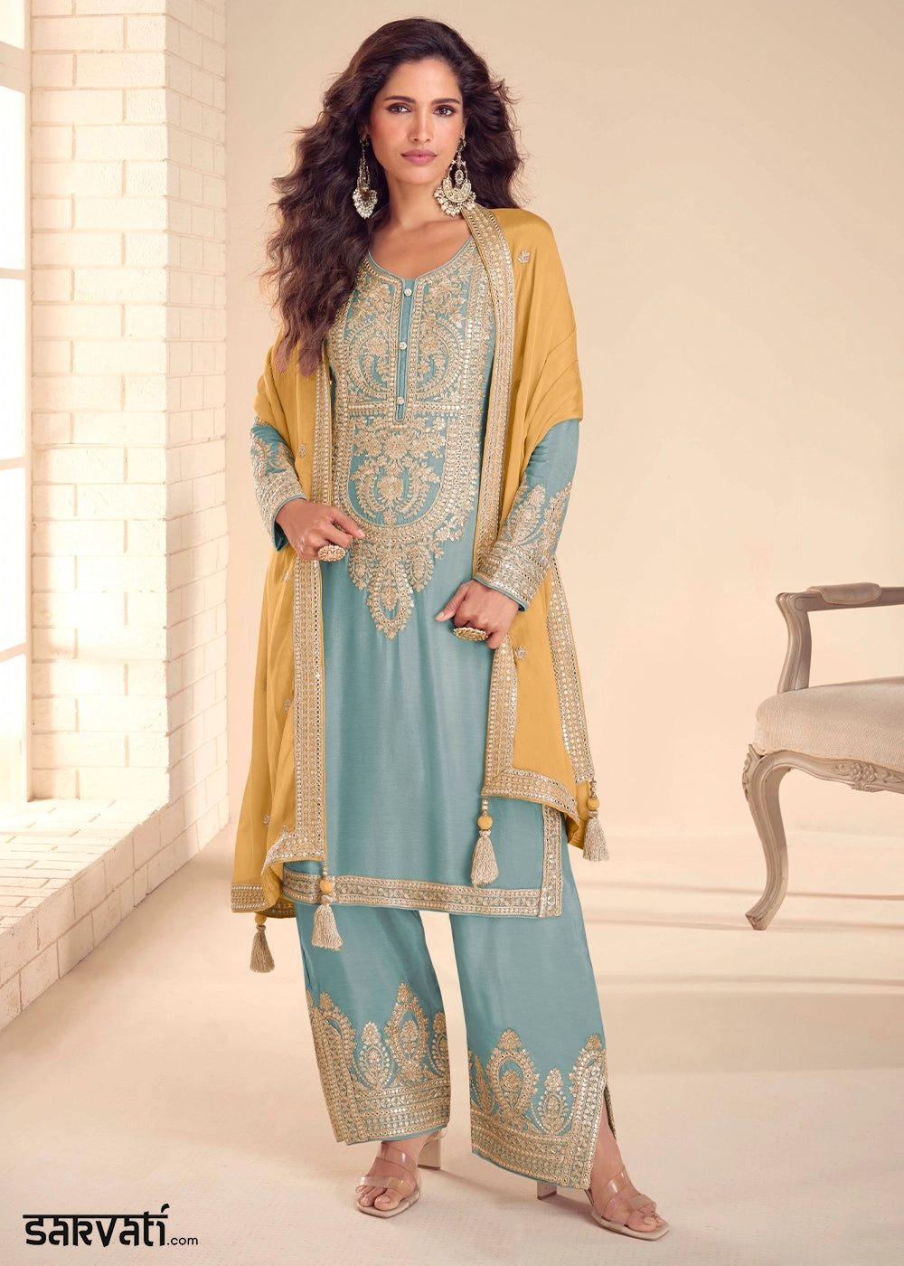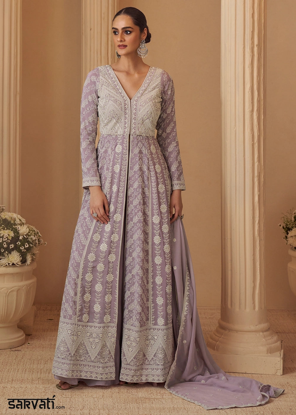 Lilac Purple Palazzo Suit with Delicate Embroidery on Luxurious Chinon Silk Fabric