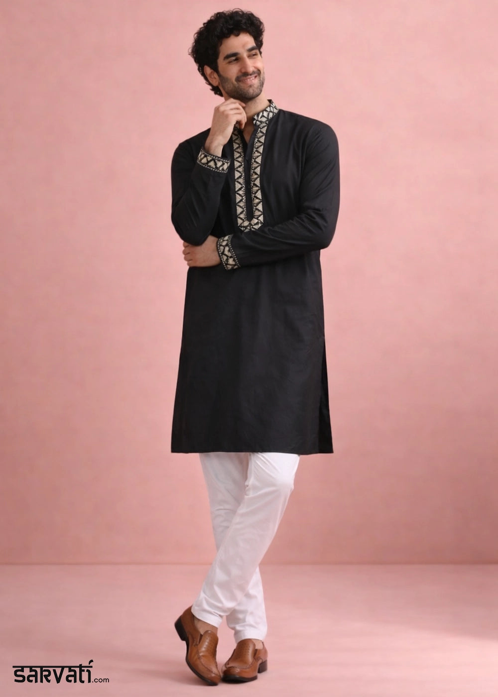 Onyx Black Viscose Silk Kurta with Multi-Thread Embroidery