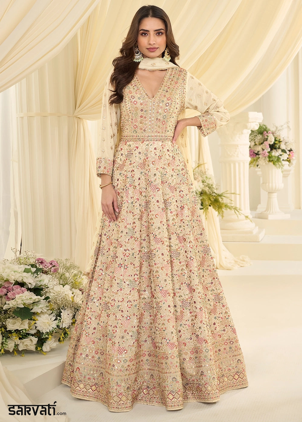 Cream & Green Viscose Banarasi Silk Saree with Intricate Floral and Zari Work