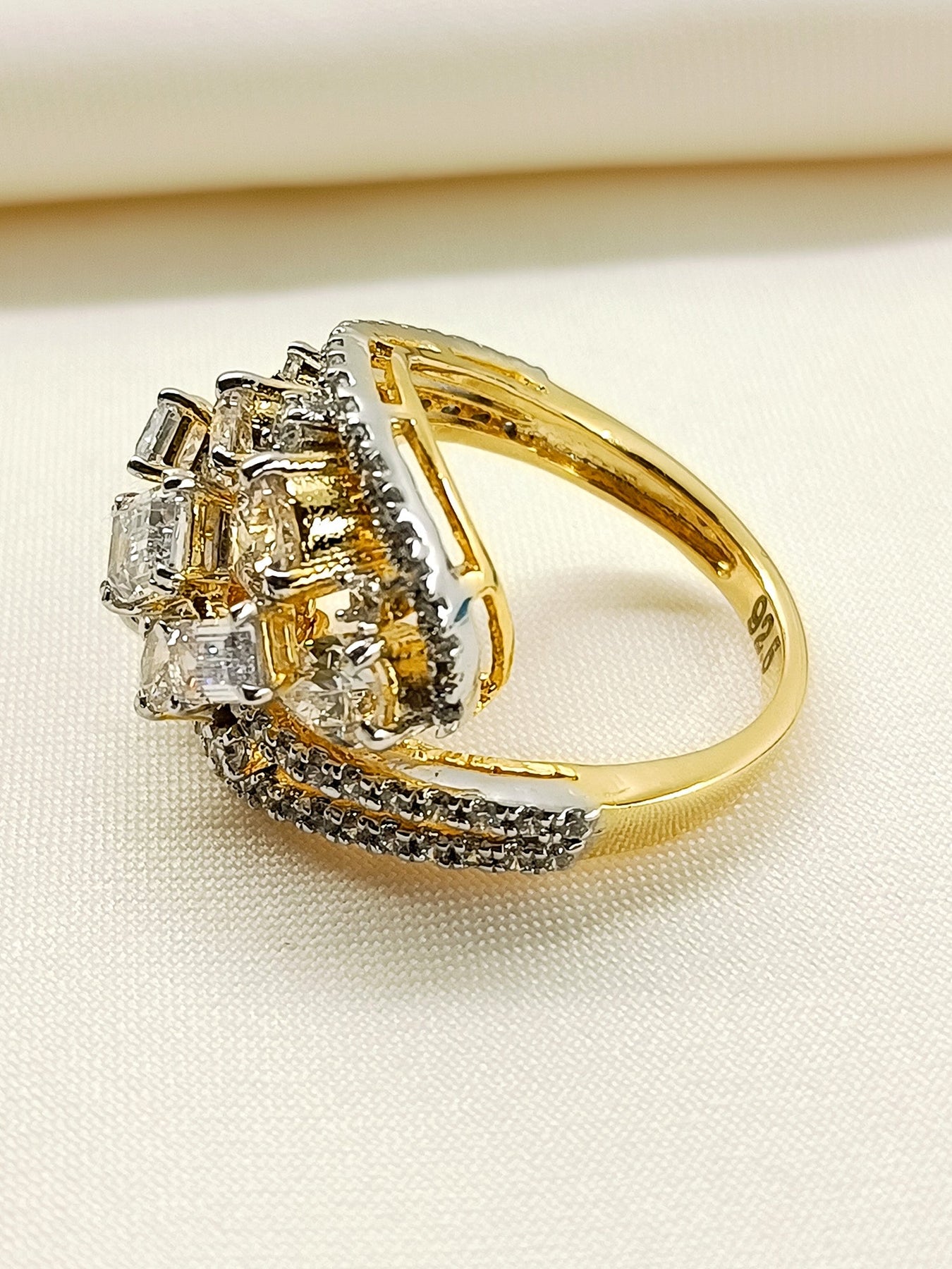 Elevate Your Jewelry Collection With This Exquisite 92.5 Silver Finger Ring Featuring Genuine Swarovski Stones. The Luxurious Gold Plating Enhances Its Premium Appeal, While The Combination Of American Diamonds And Semi-precious Stones Creates A Sophisticated Sparkle. Meticulously Crafted For Both Durability And Elegance, This Ring Makes A Perfect Statement Piece For Special Occasions Or Everyday Refinement.