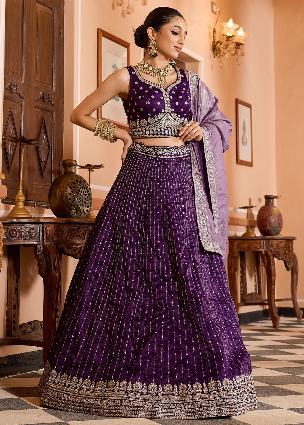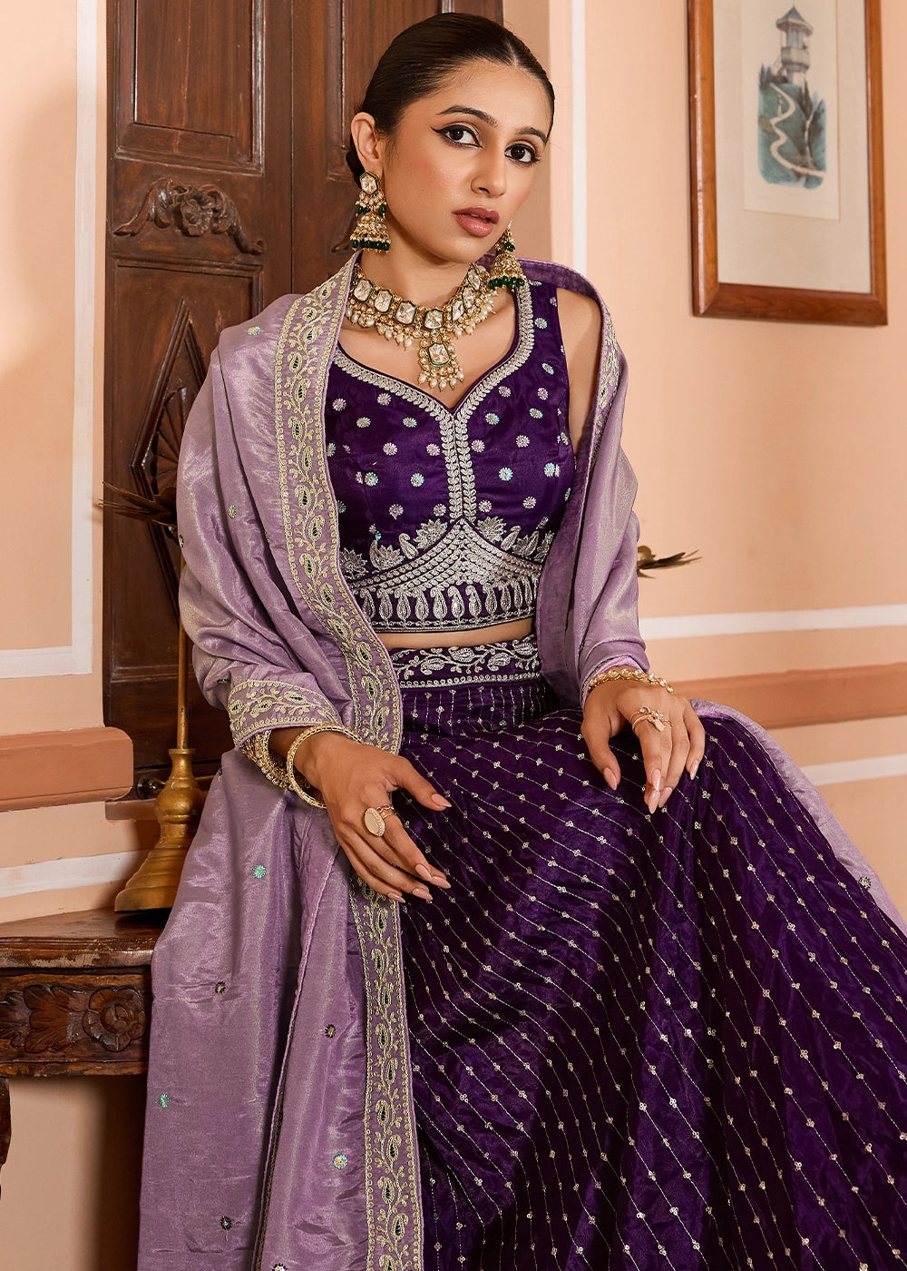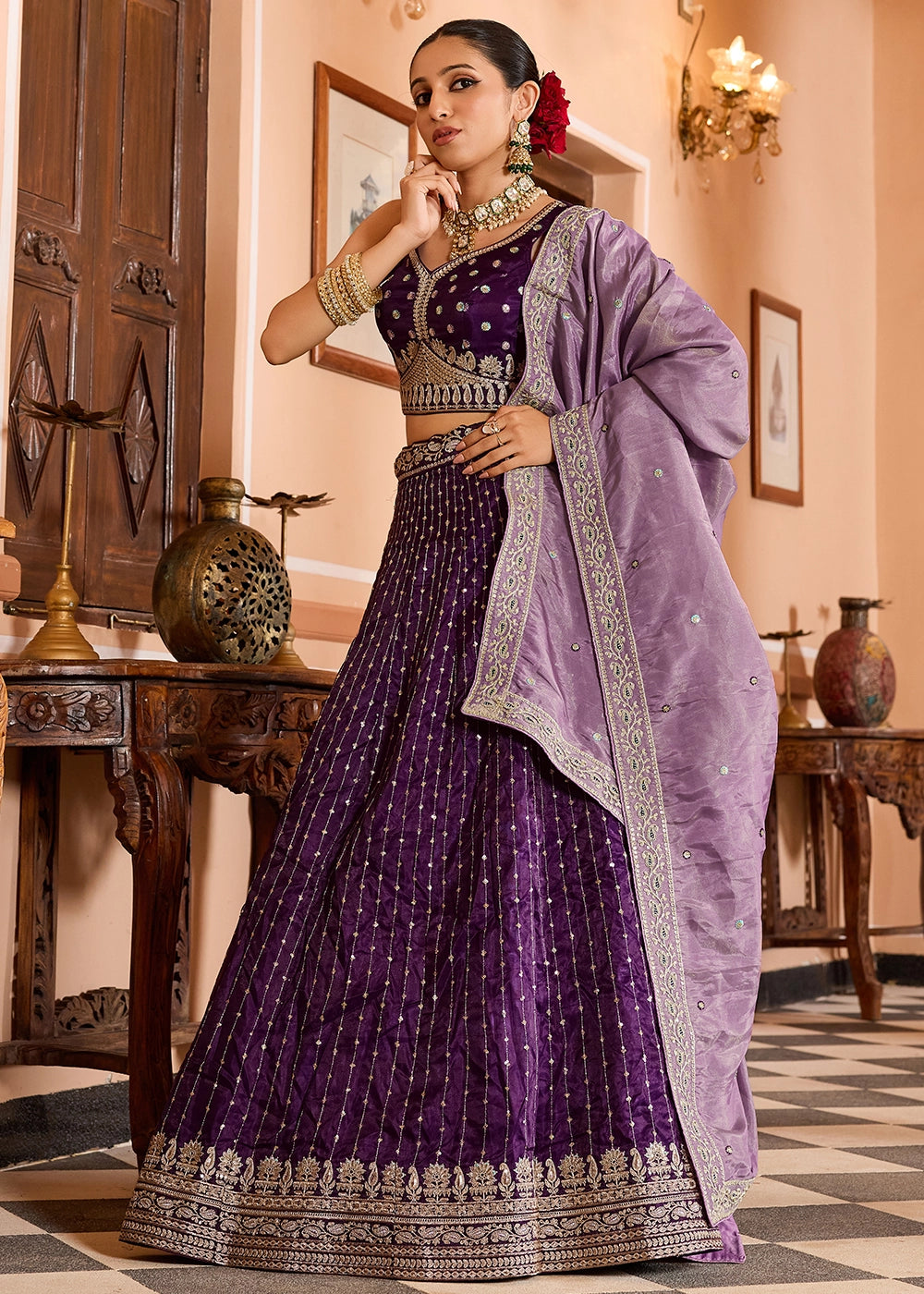 Plum Purple Embroidered Tissue Silk Lehenga Choli with Sequins Work