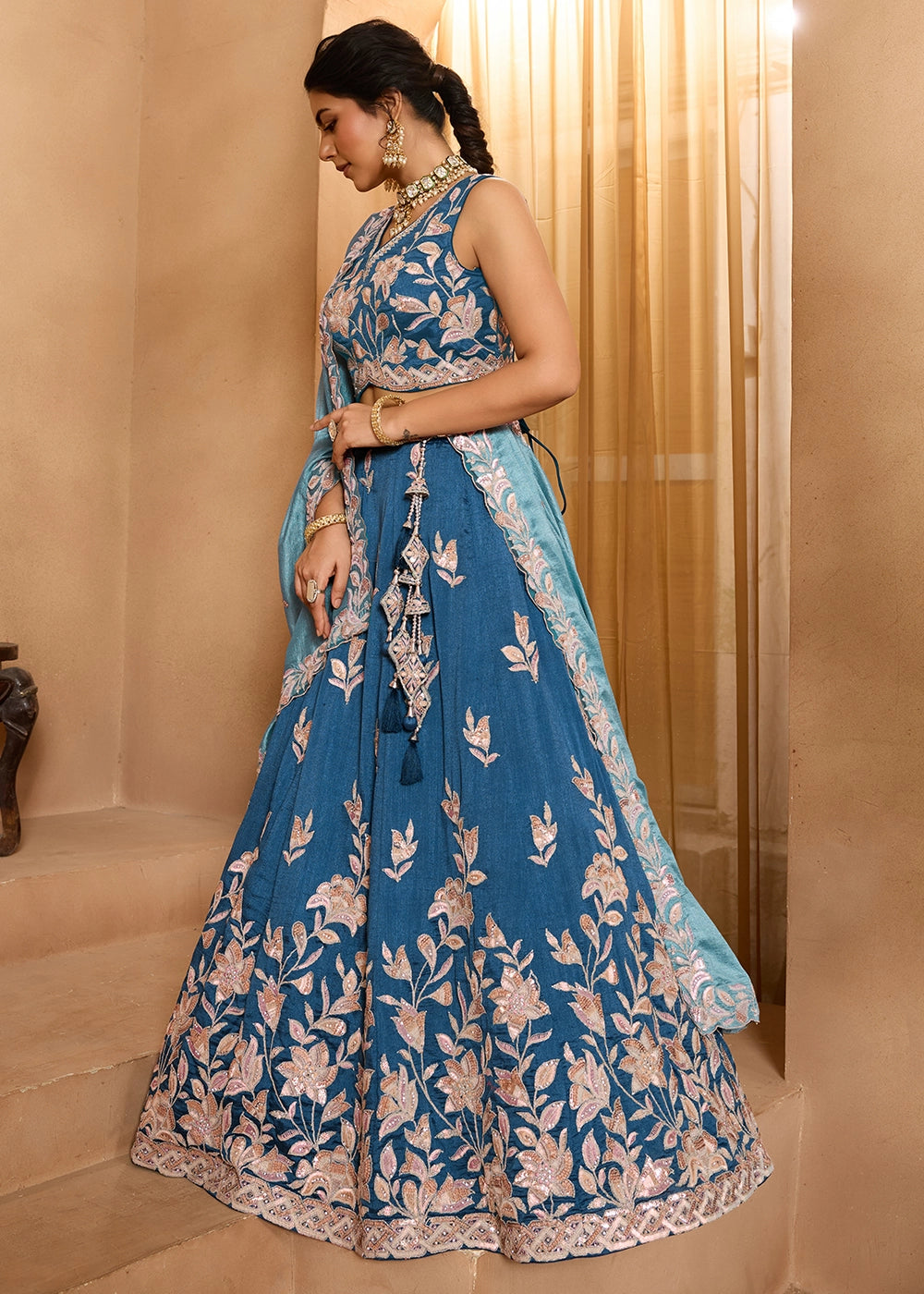 Sapphire Blue Silk Lehenga Choli with Handcrafted Floral & Sequin Work