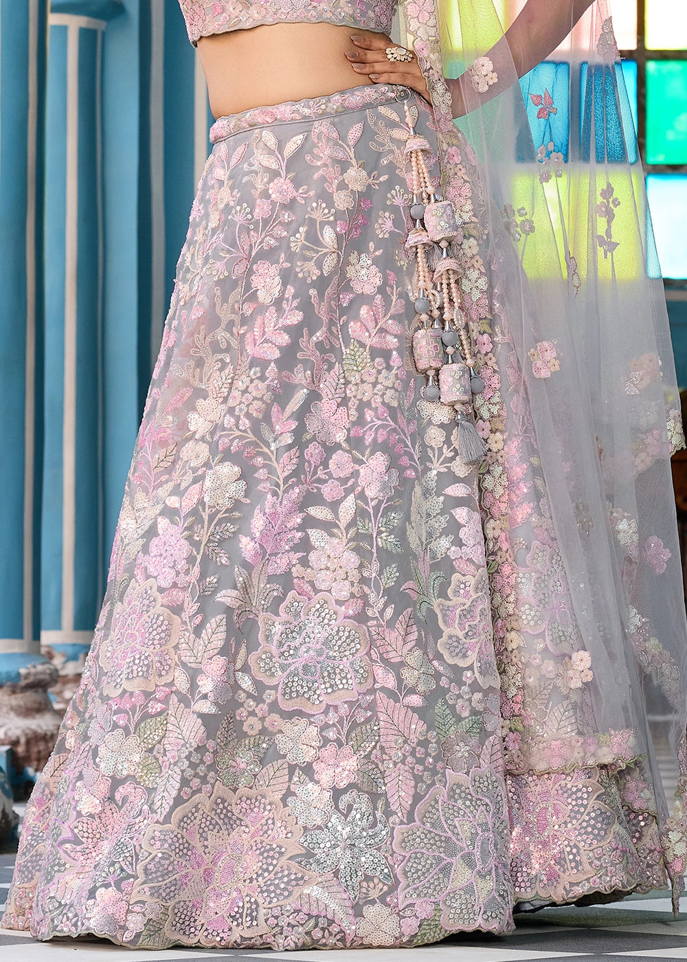 Zinc Grey Embroidered Net Lehenga Choli with Sequins Work