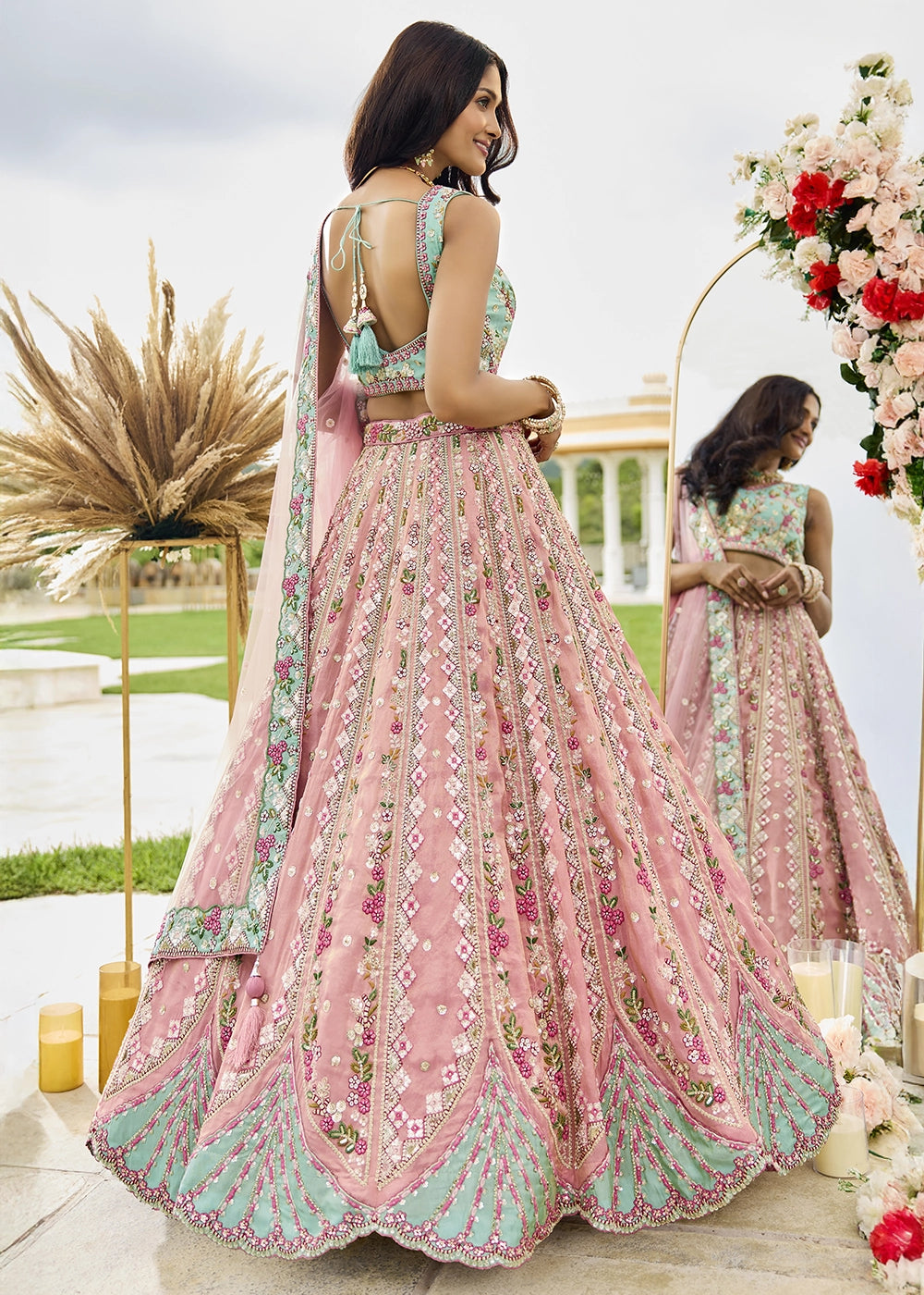 Light Pink Tissue Lehenga Choli with Handcrafted Floral & Sequin Work