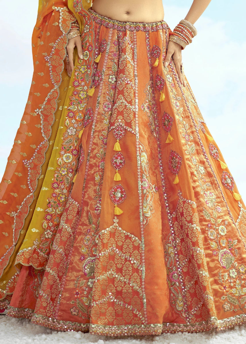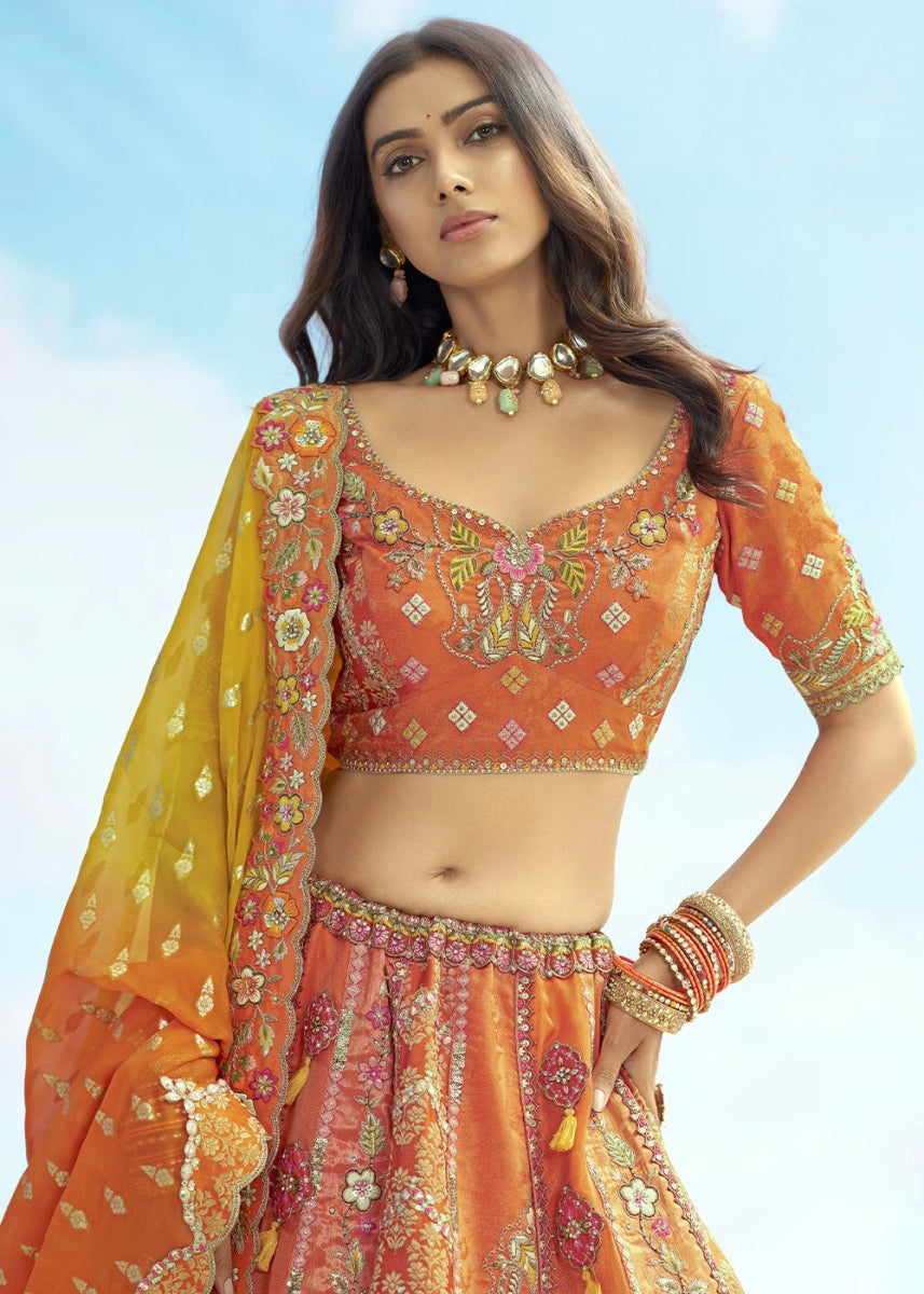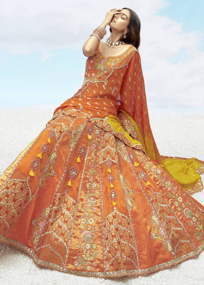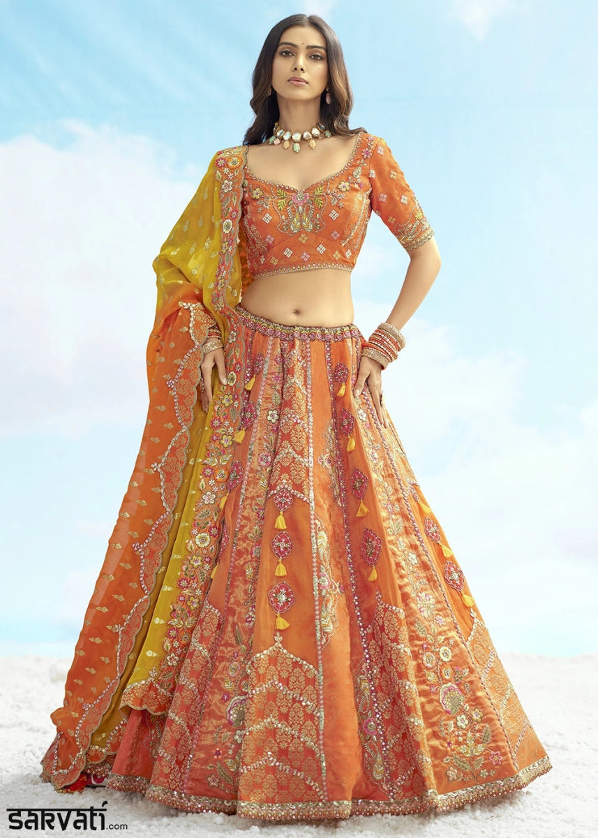 Fire Orange Banarasi Silk Lehenga Choli with Intricate Embroidery and Cut Work