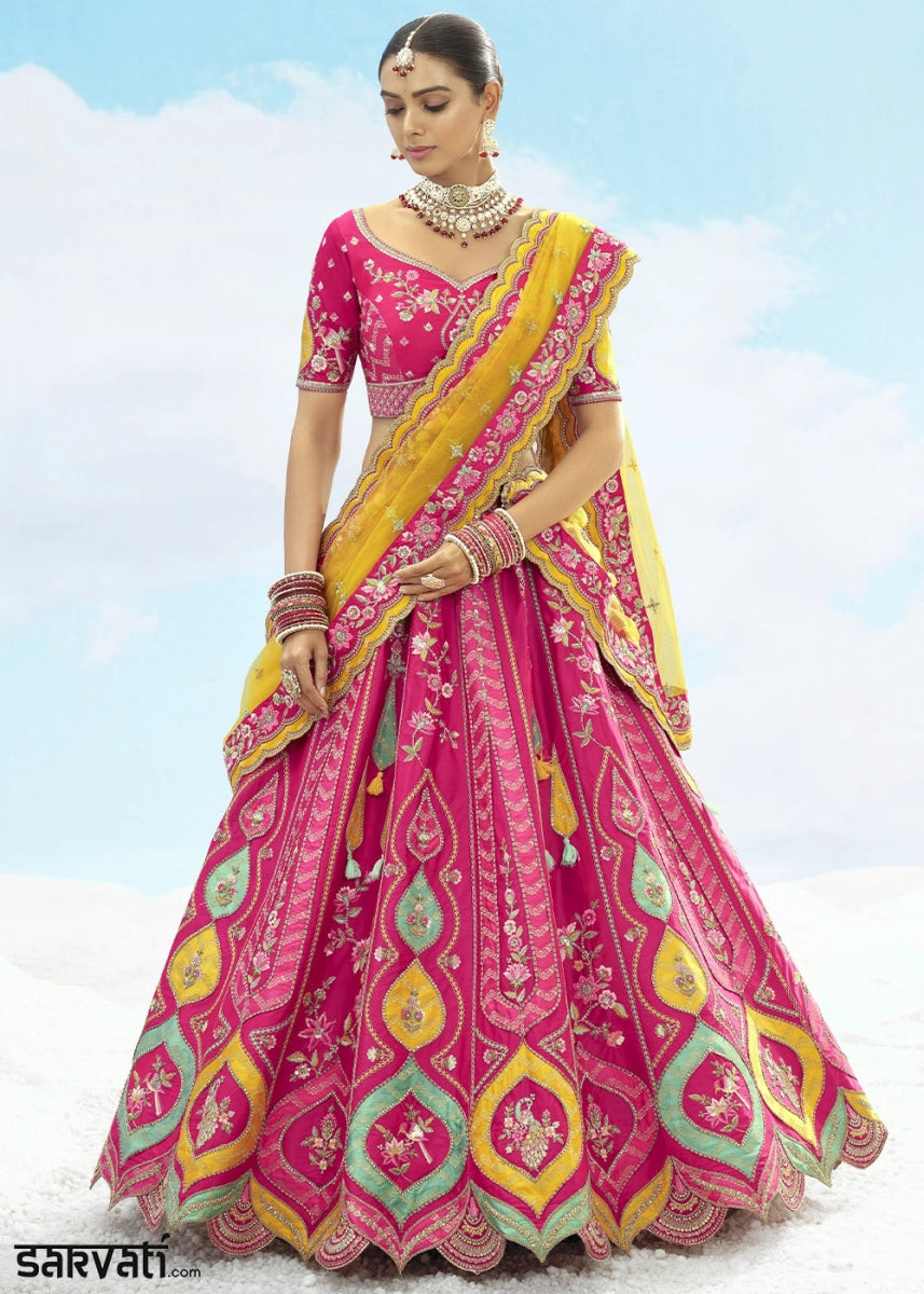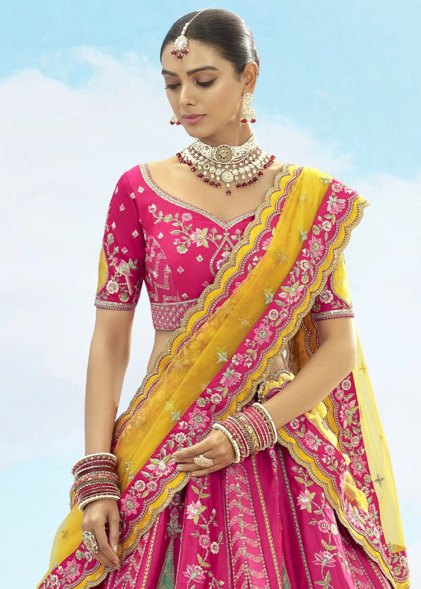 Hot Pink Banarasi Silk Lehenga Choli with Intricate Embroidery and Cut Work