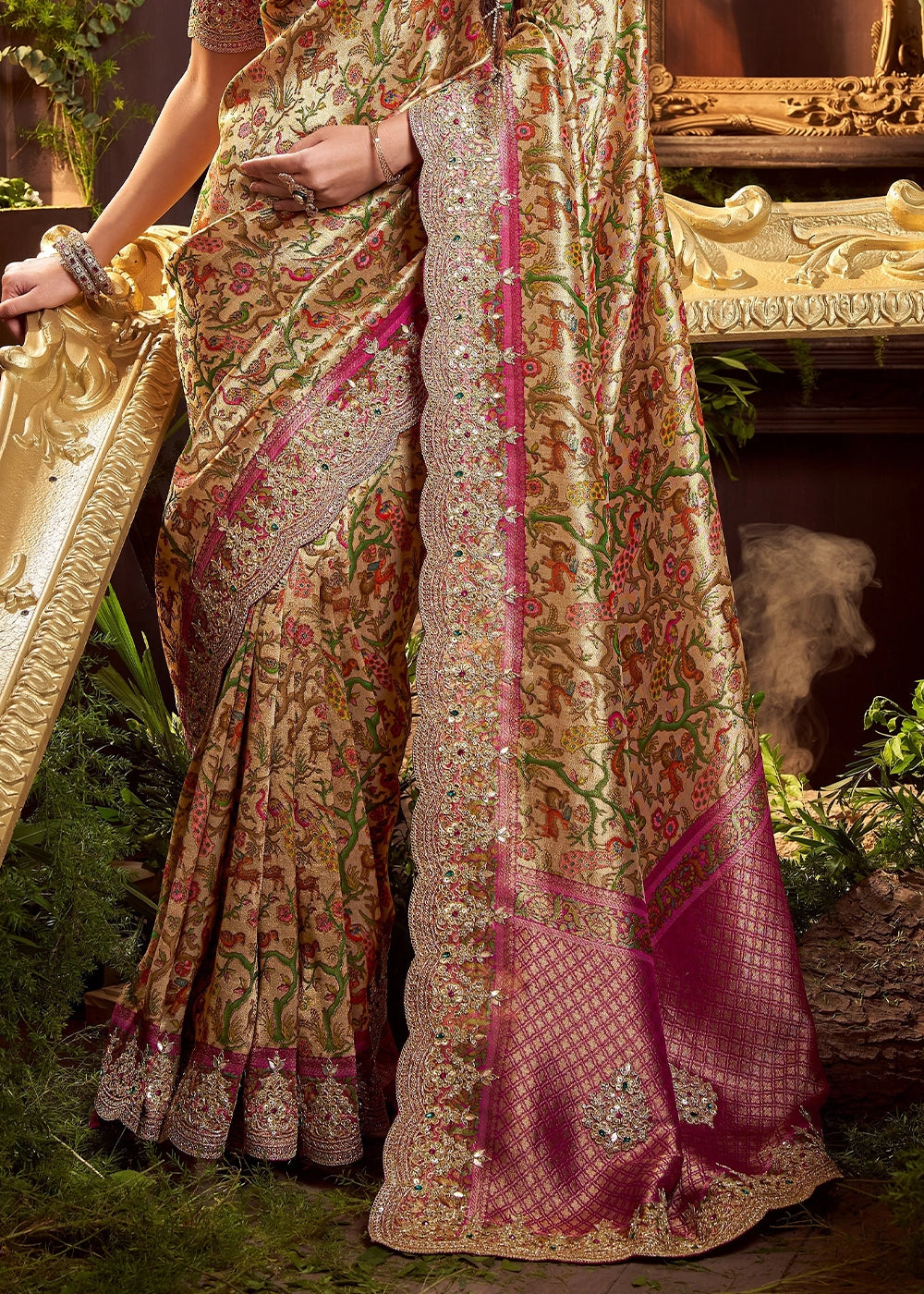 Cream & Pink Viscose Banarasi Silk Saree with Intricate Floral and Zari Work