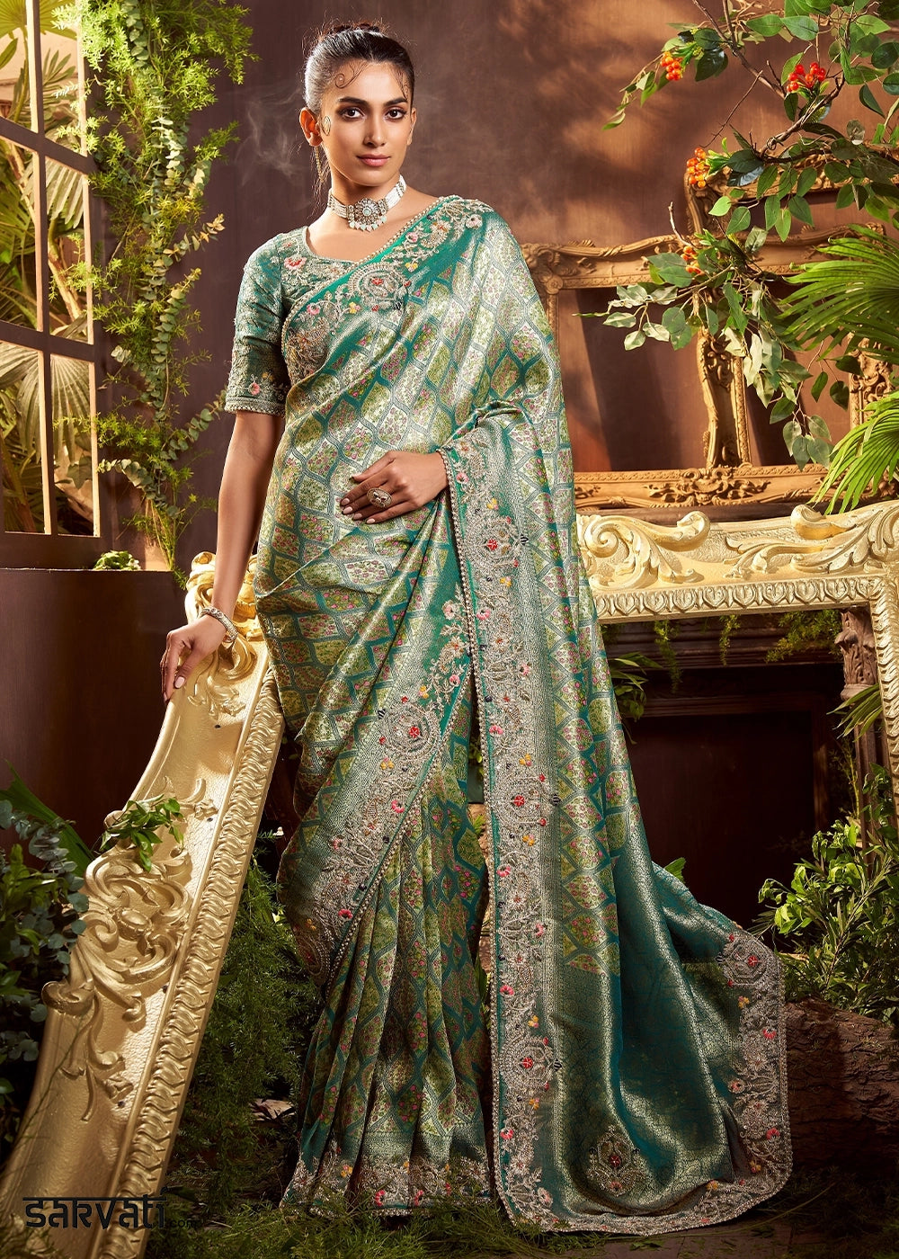 Jade Green Banarasi Silk Saree featuring Heavy Embroidery and Zari Detailing
