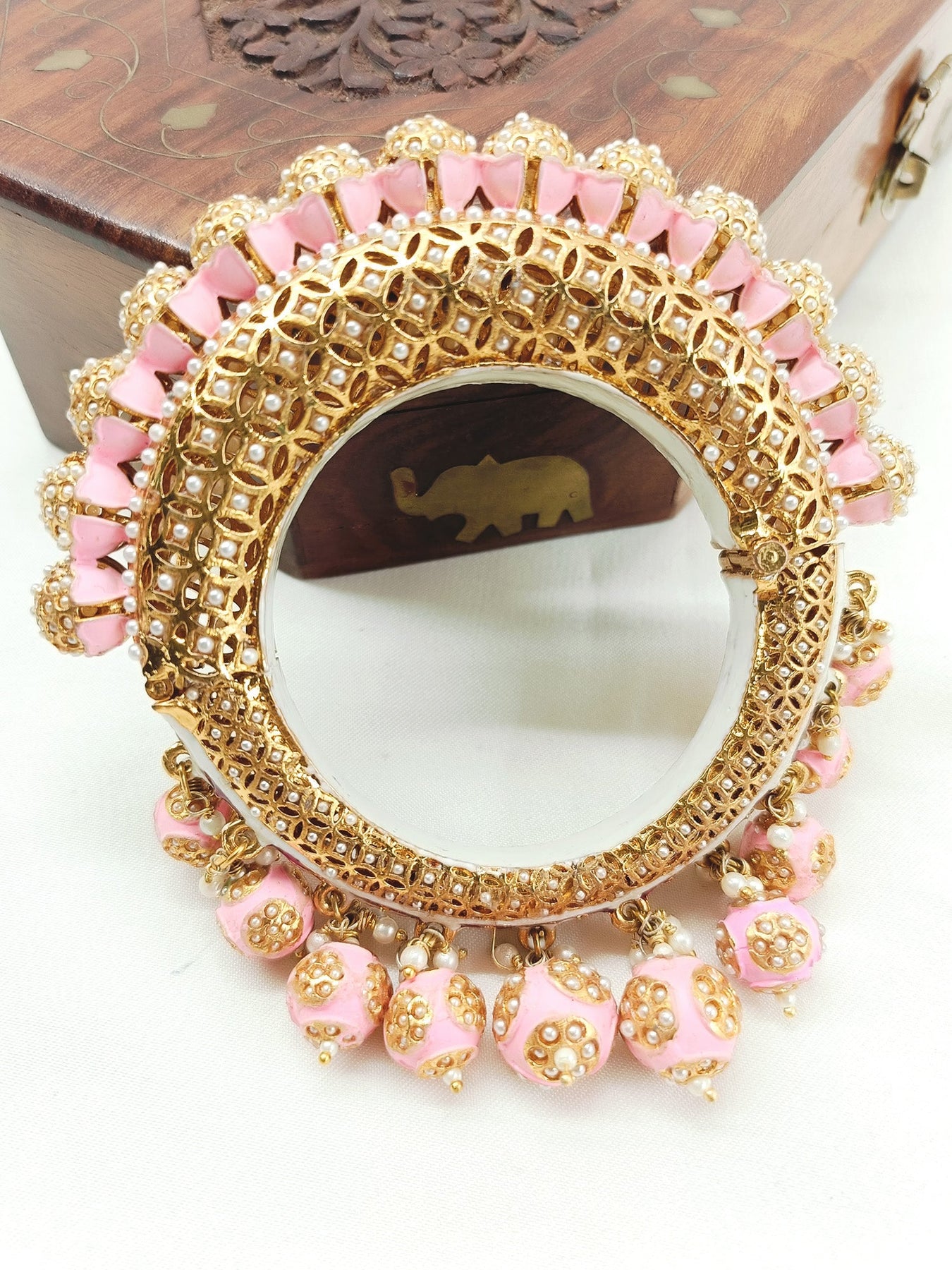 Crafted From Brass With Antique Gold Plating, This Exquisite Kada Showcases Traditional Meenakari Artistry Enhanced With Lustrous Pearls And A Refined Antique Polish. The Baby Pink Hue, Combined With Intricate Enamel Work, Creates A Sophisticated Piece That Bridges Heritage Craftsmanship With Contemporary Elegance. Perfect For Special Occasions Or As A Treasured Addition To Your Jewelry Collection, This Kada Exemplifies Timeless Artisanal Excellence.