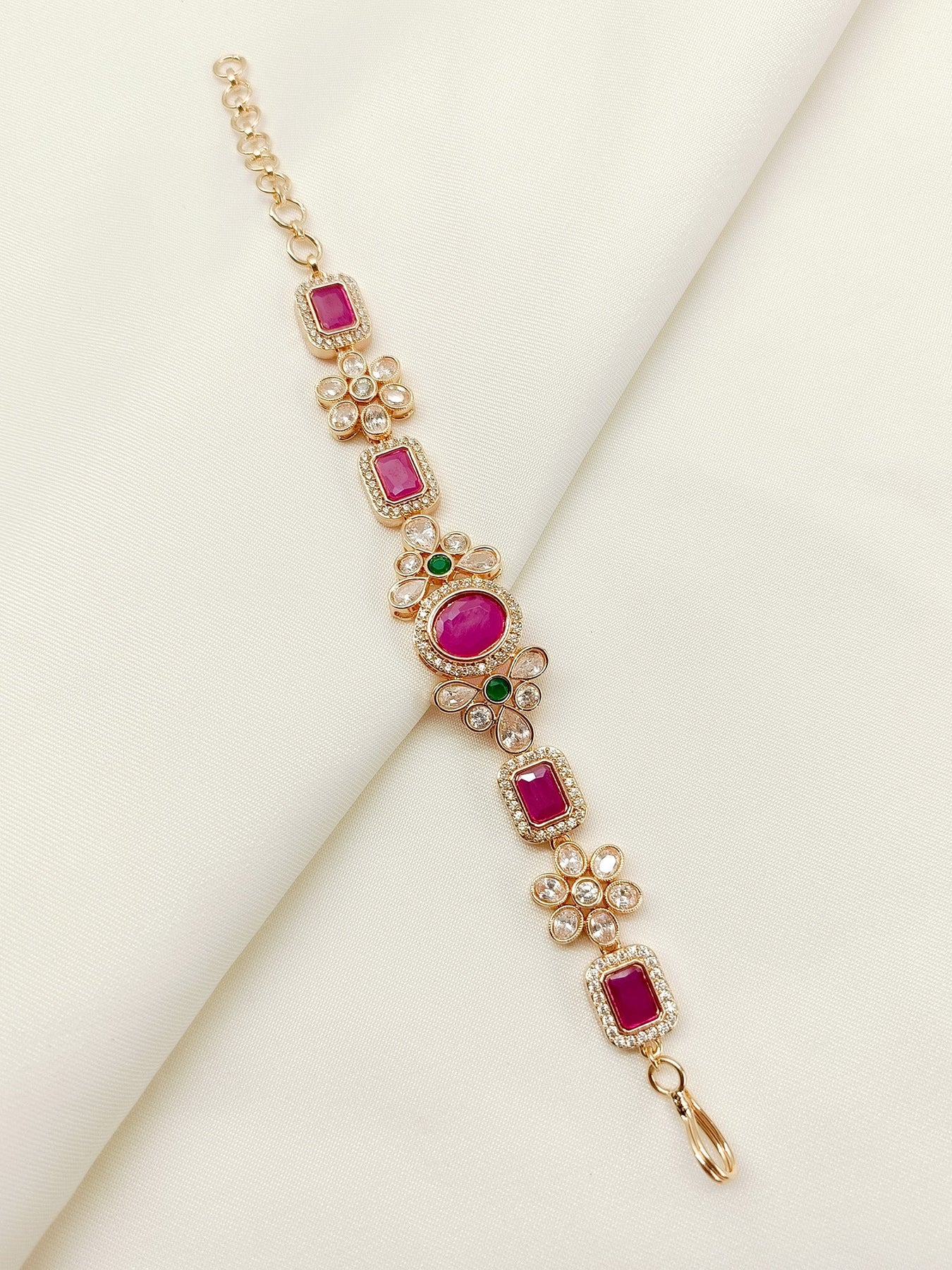 Discover The Timeless Elegance Of The R&G Antique Bracelet. Crafted With Traditional Design, This Bracelet Features A Stunning Combination Of Ruby And Green Colors, Complemented By Gold Plating And American Diamond Detailing. The Use Of Semi-precious Stones Adds A Luxurious Touch. Elevate Your Style With This Exquisite Piece.