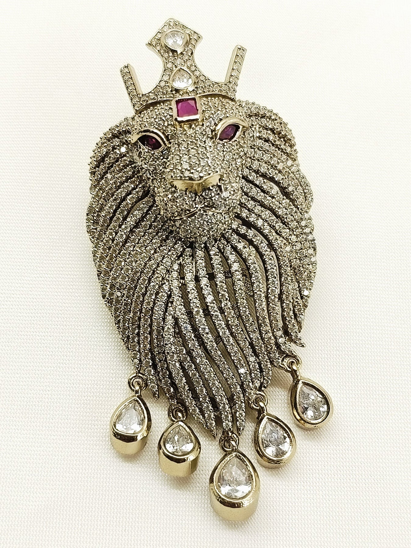 The Ruby Lion Brooch Combines Antique Gold-plated Brass With Carefully Set American Diamonds And Semi-precious Stones, Creating A Finely Detailed Accessory With Timeless Appeal. This Expert-crafted Piece Offers Durability And A Distinctive Vintage Aesthetic, Making It Ideal For Adding A Touch Of Elegant Sophistication To Any Ensemble.