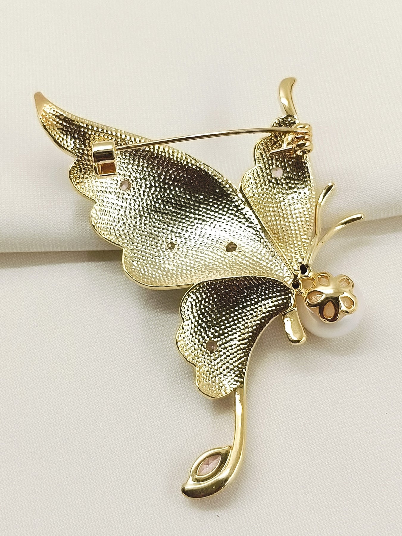 Elevate Your Accessory Collection With This Exquisite White Butterfly Brooch, Meticulously Crafted From Gold-plated Brass For Lasting Elegance. The Design Features Lustrous Mother Of Pearl Accents That Capture Light Beautifully, Complemented By Sparkling American Diamonds That Add Refined Sophistication. Perfect For Securing Scarves, Adorning Lapels, Or Enhancing Evening Wear, This Brooch Combines Timeless Charm With Contemporary Allure. The Premium Materials Ensure Durability While Maintaining A Luxurious Aesthetic That Complements Both Classic And Modern Wardrobes.