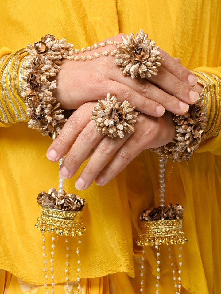 This Stunning Copper Floral With Pearl Hanging Kalire Feature Intricate Traditional Designs And Elegant Gold Carvings, Adorned With A Gold-plated Brass Metal And Pearls. The Long Pearl Chain Hangings Add A Touch Of Sophistication To These Beautiful Kaleeras, Making Them Perfect For Any Traditional Occasion. Crafted With Care, These Kalire Are A Timeless Addition To Any Wedding Ensemble.