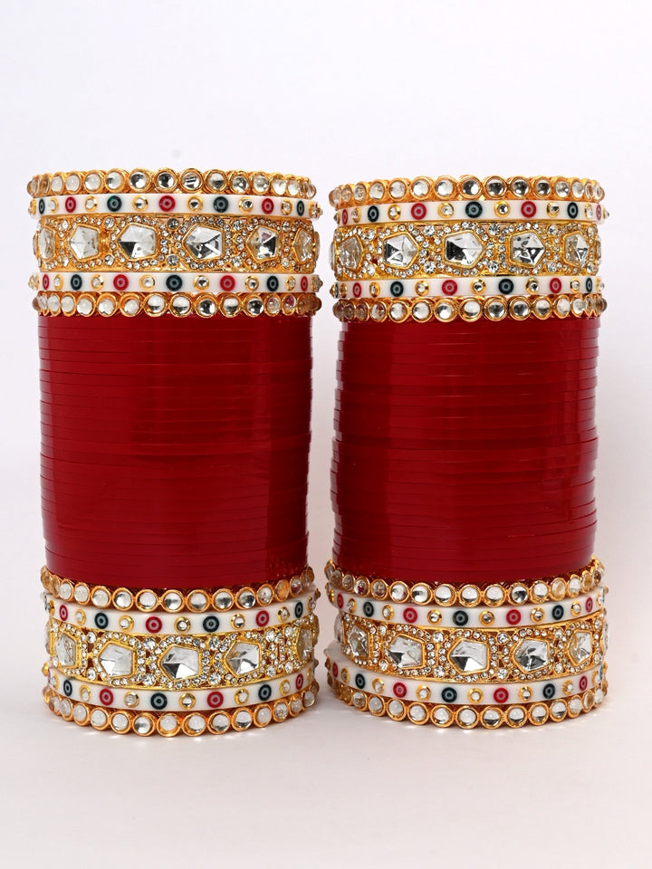 This Bridal Chura Set Is The Perfect Addition To Any Traditional Indian Wedding Outfit. With Kundan Bangles On Each Side Gold Plated Brass Metal, The Latest Design Features Sleek Maroon Acrylic Bangles For A Touch Of Elegance. Stand Out On Your Special Day With This Stunning Chura Set.