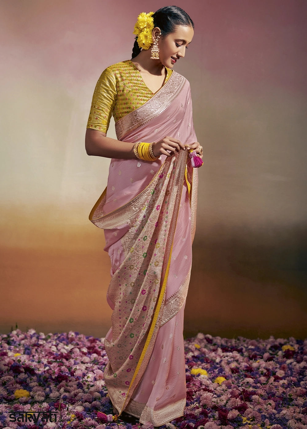 Peach Pink Zari Woven Dola Silk Saree with Meenakari Pallu