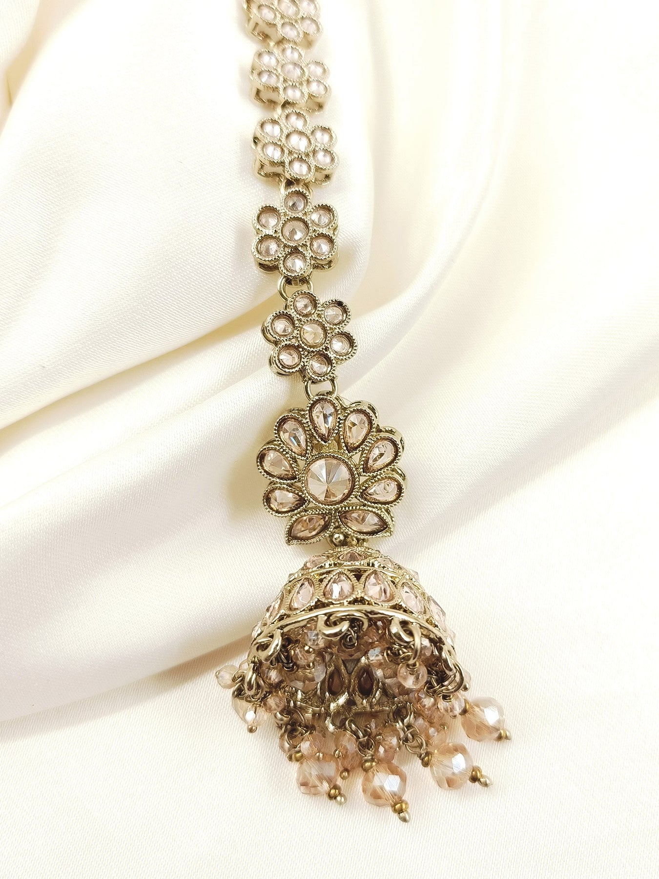 Elevate Your Ethnic Ensemble With These Exquisite Copper Polki Jhumkis, Masterfully Crafted With Antique Gold-plated Brass For Timeless Sophistication. Each Earring Features Authentic Polki Stones Set In Traditional Designs, Complemented By Delicate Sheeshpatti Detailing That Catches Light Beautifully. Lustrous Beads Cascade Gracefully From The Base, While Semi-precious Stones Add Depth And Perfect For Weddings, Festivals, Or Special Occasions, These Jhumkis Blend Heritage Craftsmanship With Refined Elegance, Making Them An Essential Addition To Any Jewelry Collection.