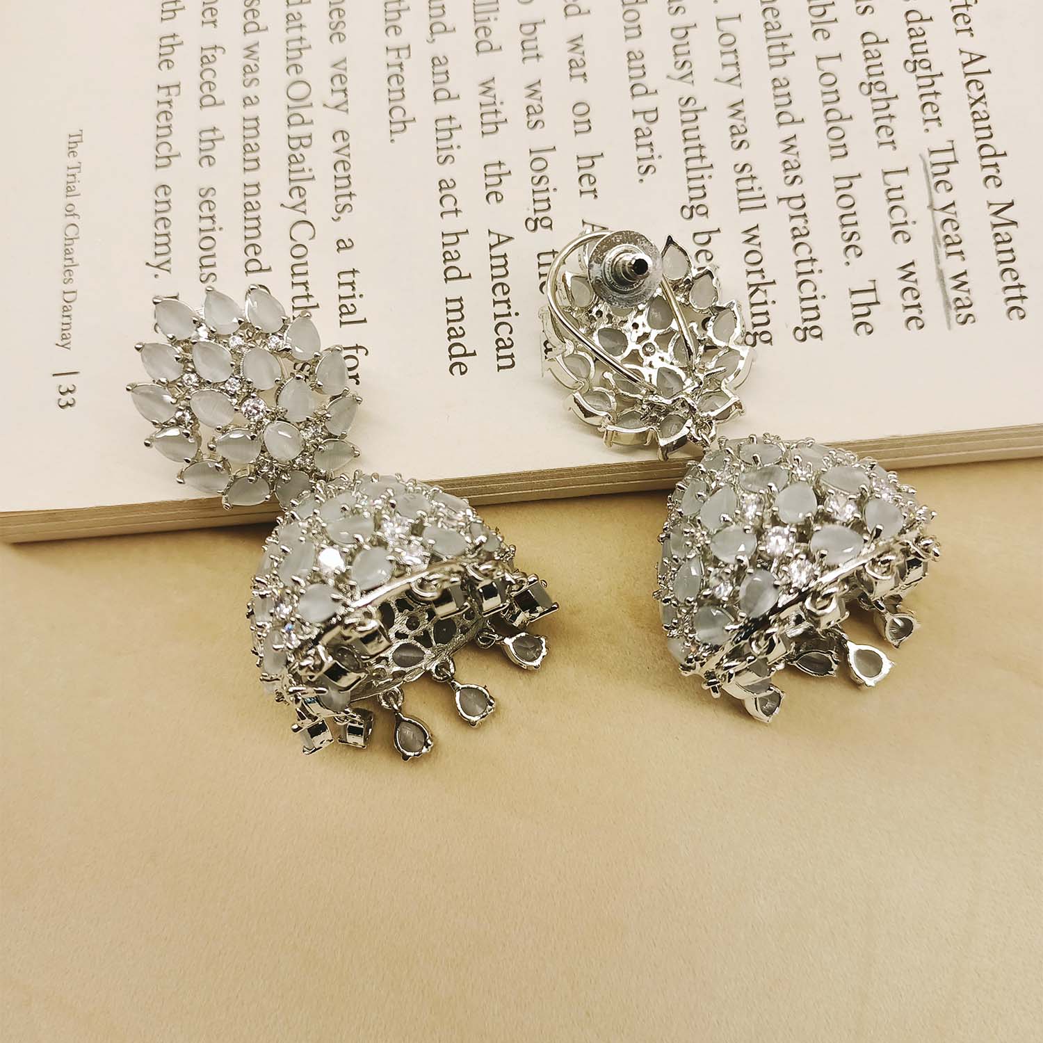 Beautiful American Diamond And Pear Shape Light Grey Color Stone Western Jhumkas