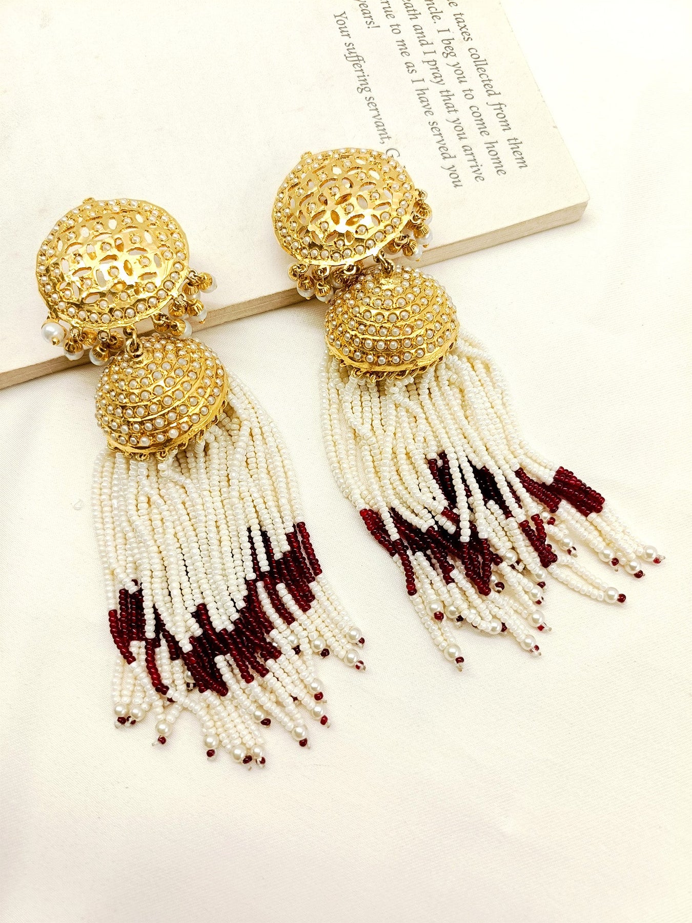 Look Fabulous In Our Maroon Jadau Jhumki Featuring Gold Plated Brass Metal And Hanging Faceted Maroon Beads With Pearl Accents. Perfect For Formal Or Casual Occasions, Add A Touch Of Glamour And Style With These Jhumki Earrings.