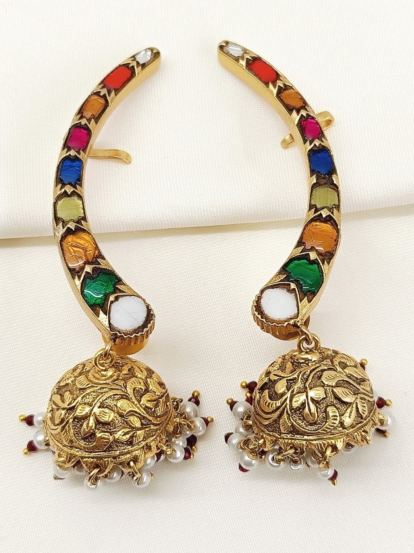 Elevate Your Traditional Collection With The Kundan Jhumki, Featuring Exquisite Antique Gold Plating That Enhances Its Vintage Charm. Adorned With Semi-precious Stones And Delicate Pearls, This Jhumki Offers A Refined Blend Of Elegance And Cultural Heritage, Perfect For Special Occasions And Festive Wear. Its Intricate Craftsmanship Ensures A Timeless Accessory That Complements Both Ethnic And Contemporary Styles.