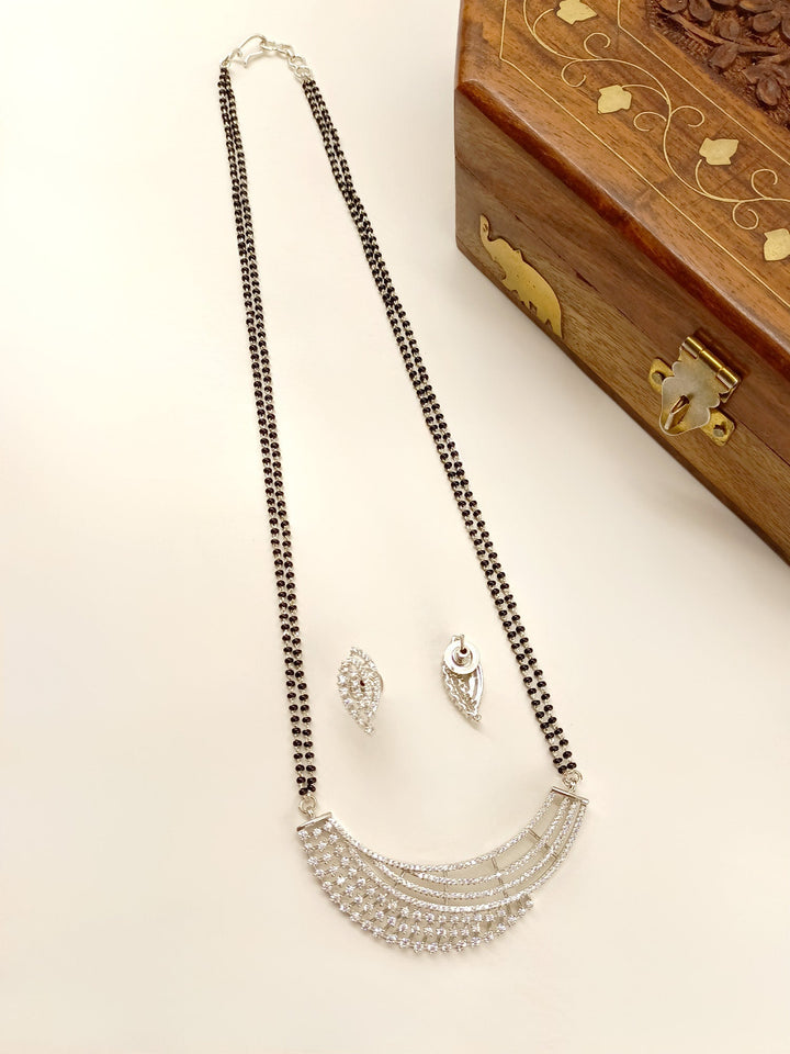 This American Diamond Mangalsutra Is Perfect For Any Traditional Indian Occasion. This Traditional Mangalsutra Features An American Diamond And A Double layered Black Bead Chain That Is Silver Plated Brass Metal. Stand Out And Look Beautiful With This Unique Piece Of Jewelry.