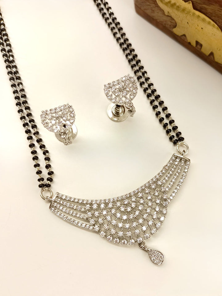 This American Diamond Mangalsutra Is Perfect For Any Traditional Indian Occasion. This Traditional Mangalsutra Features An American Diamond And A Double layered Black Bead Chain That Is Silver Plated Brass Metal. Stand Out And Look Beautiful With This Unique Piece Of Jewelry.