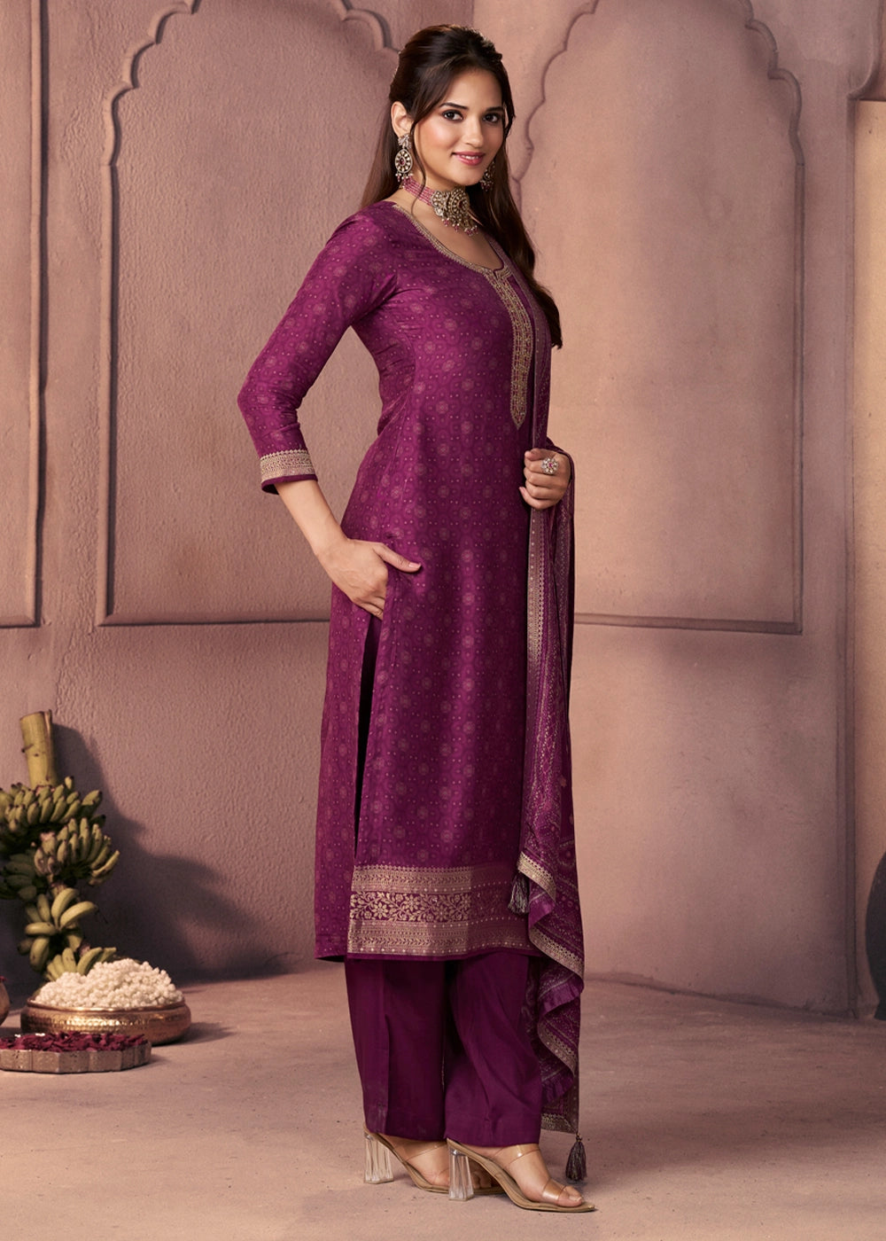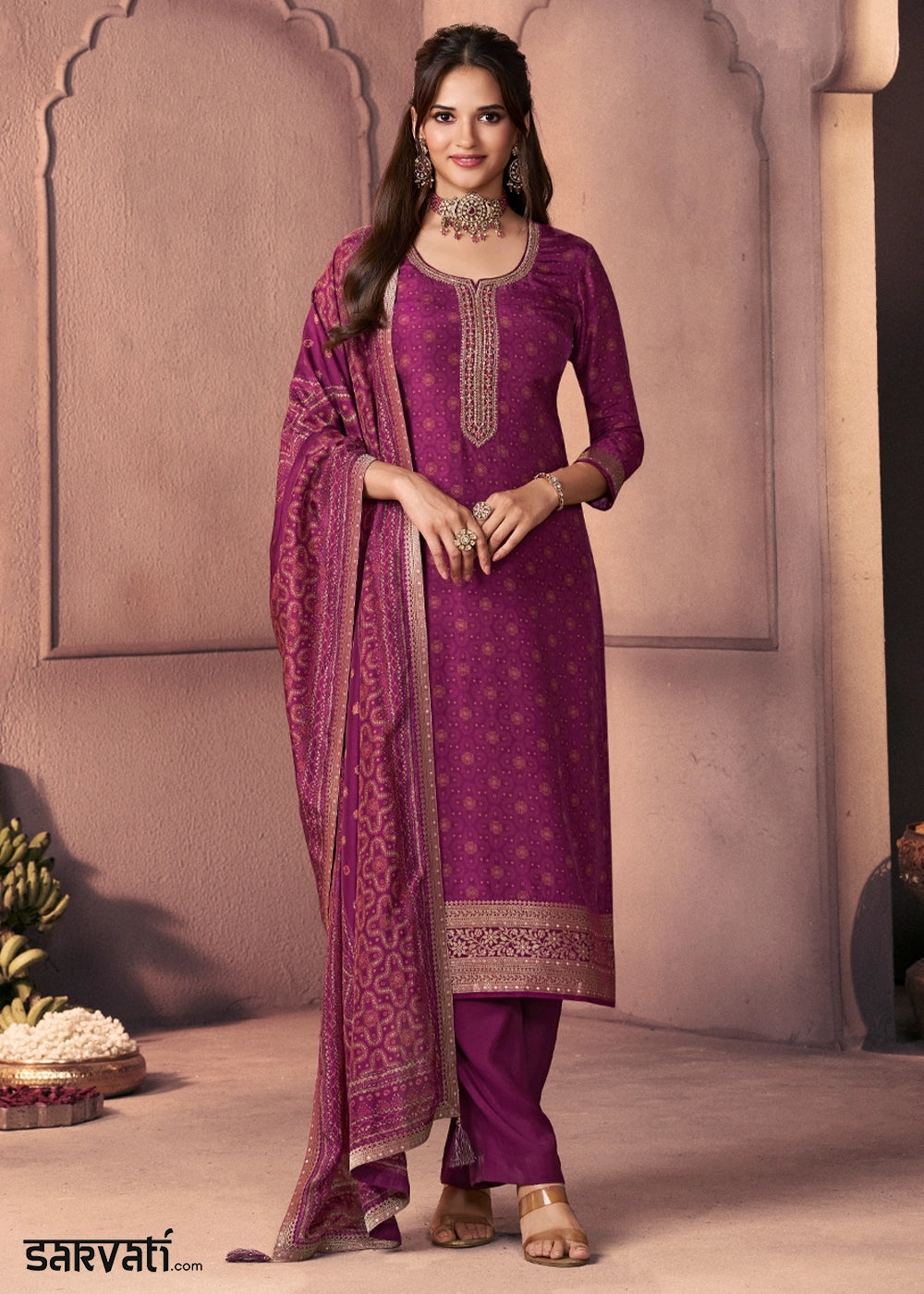 Sangria Purple Silk Suit with Ethnic Motifs & Embroidered Neckline