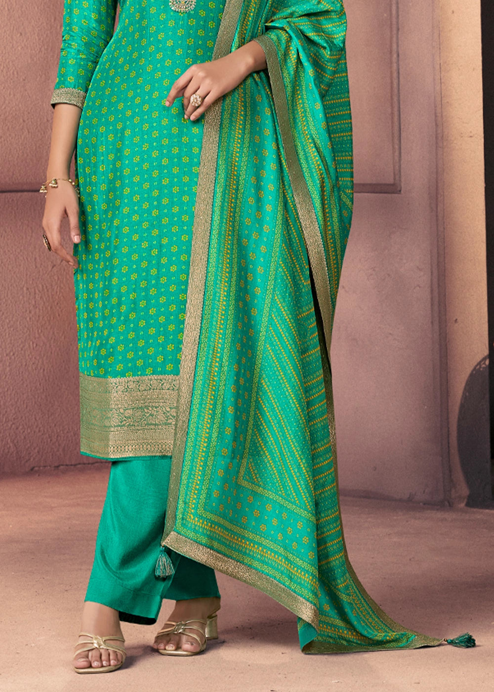 Jade Green Silk Suit with Ethnic Motifs & Embroidered Neckline