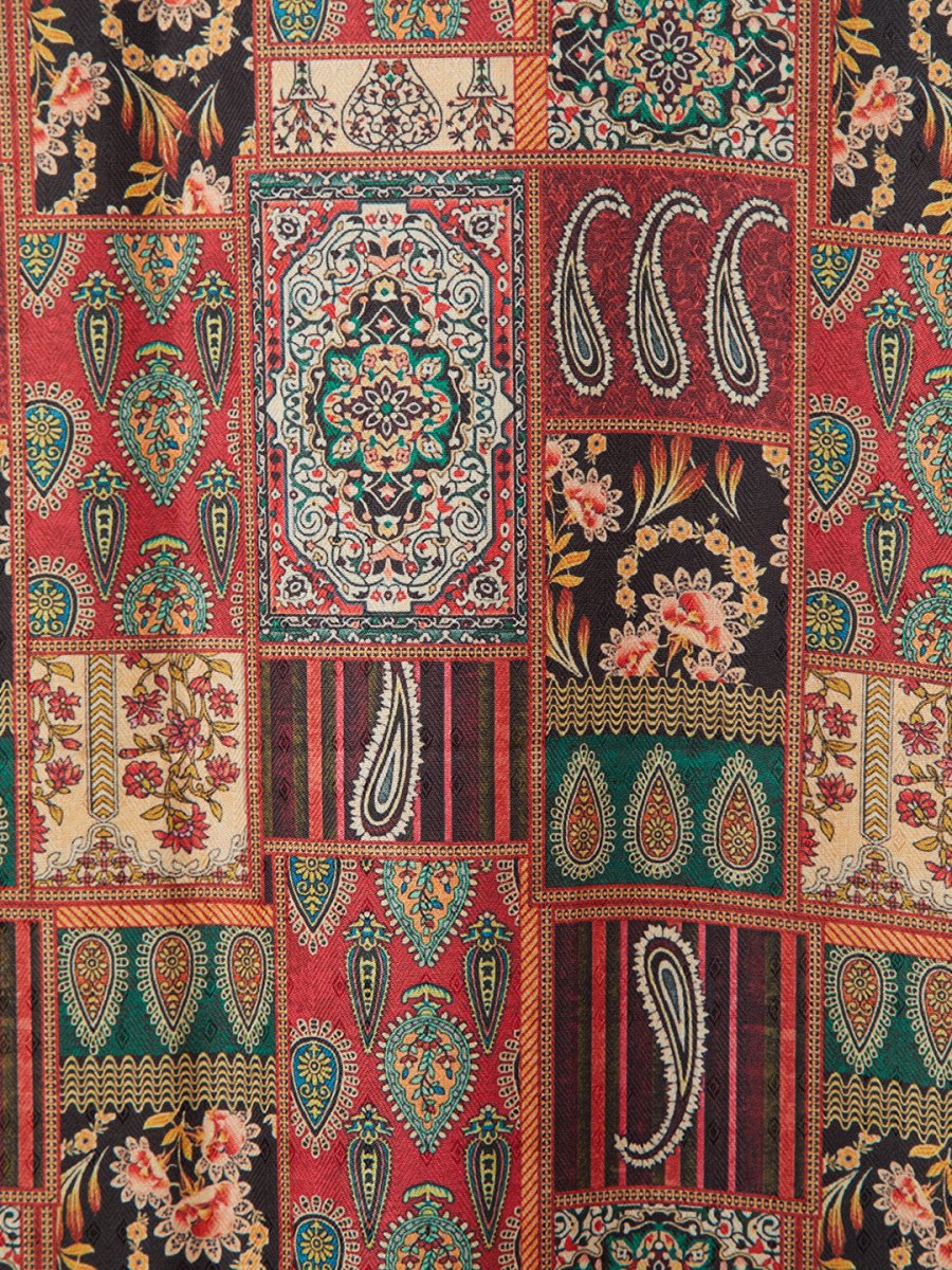 The dupatta features an artistic patchwork of traditional motifs, intricate geometric patterns, and cultural elements in warm shades of red, green, and gold, creating a rich and vintage aesthetic. making it perfect for EID ,festive occasions, weddings, and celebrations.