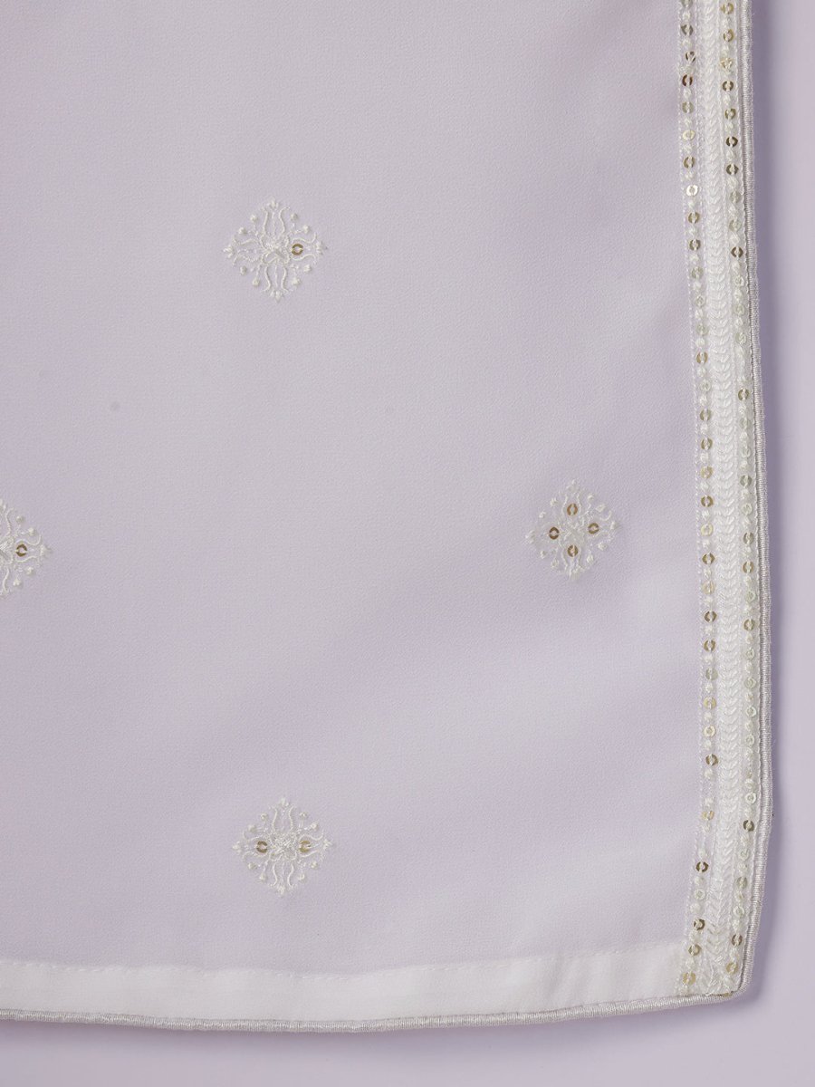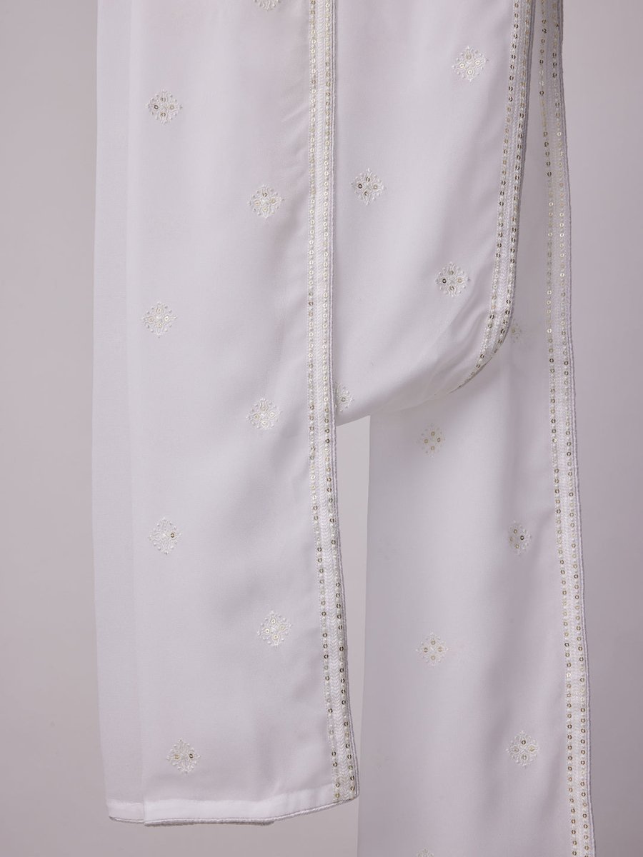 The white dupatta adorned with delicate sequin embroidery along the border, adding a touch of understated glamour.Perfect for weddings, festive celebrations, or evening cultural events.
