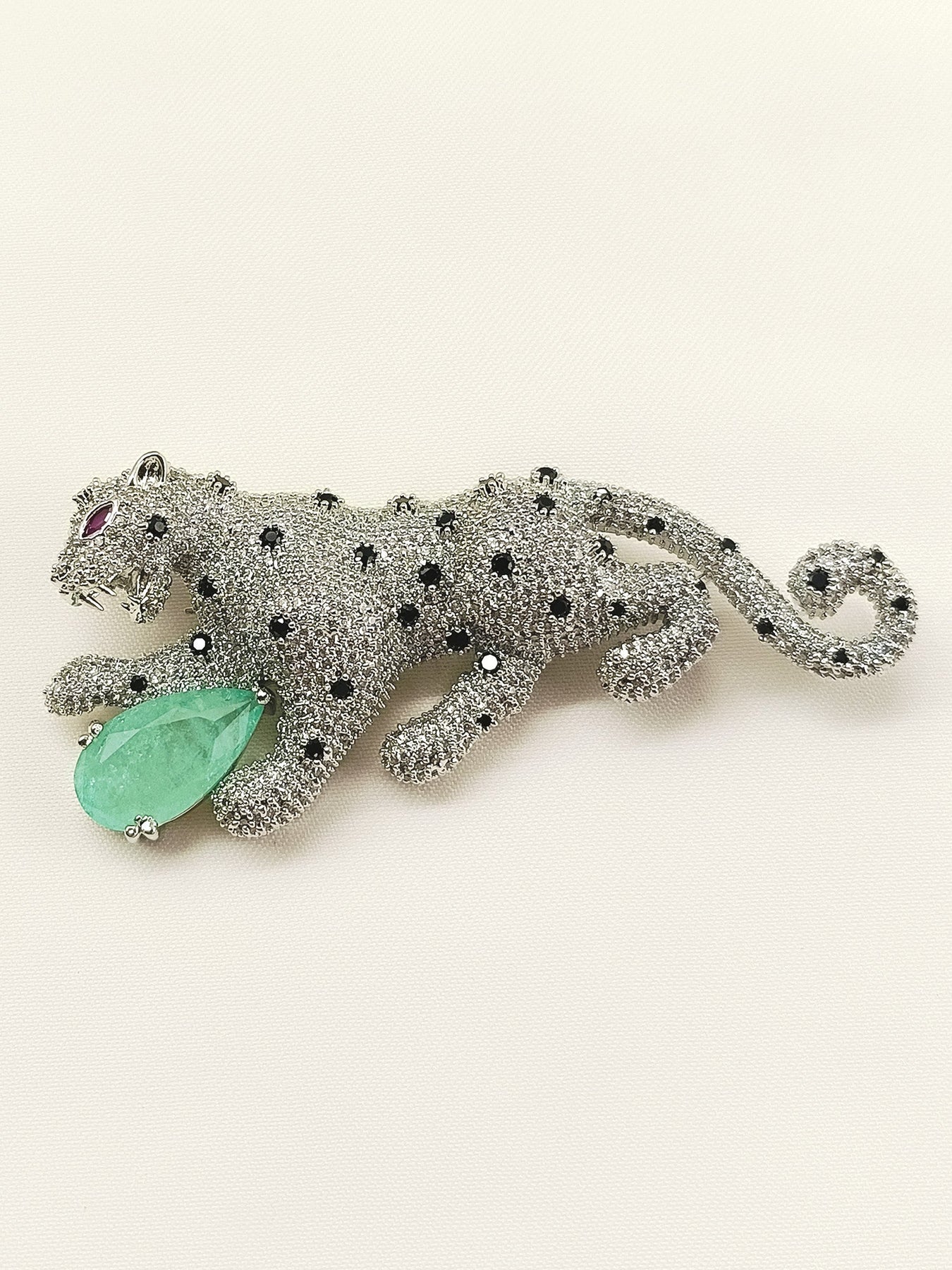 This Striking Men's Brooch Features A Bold Leopard Design In Refreshing Mint Green, Crafted From Silver-plated Brass For Lasting Durability And Elegant Shine. Adorned With Sparkling American Diamonds And Lustrous Doublet Stones, It Combines Contemporary Style With Timeless Sophistication. Perfect For Elevating Formal Wear Or Adding A Distinctive Accent To Everyday Outfits, This Piece Showcases Meticulous Craftsmanship And Premium Materials. An Ideal Accessory For The Discerning Gentleman Who Appreciates Quality And Distinctive Design.