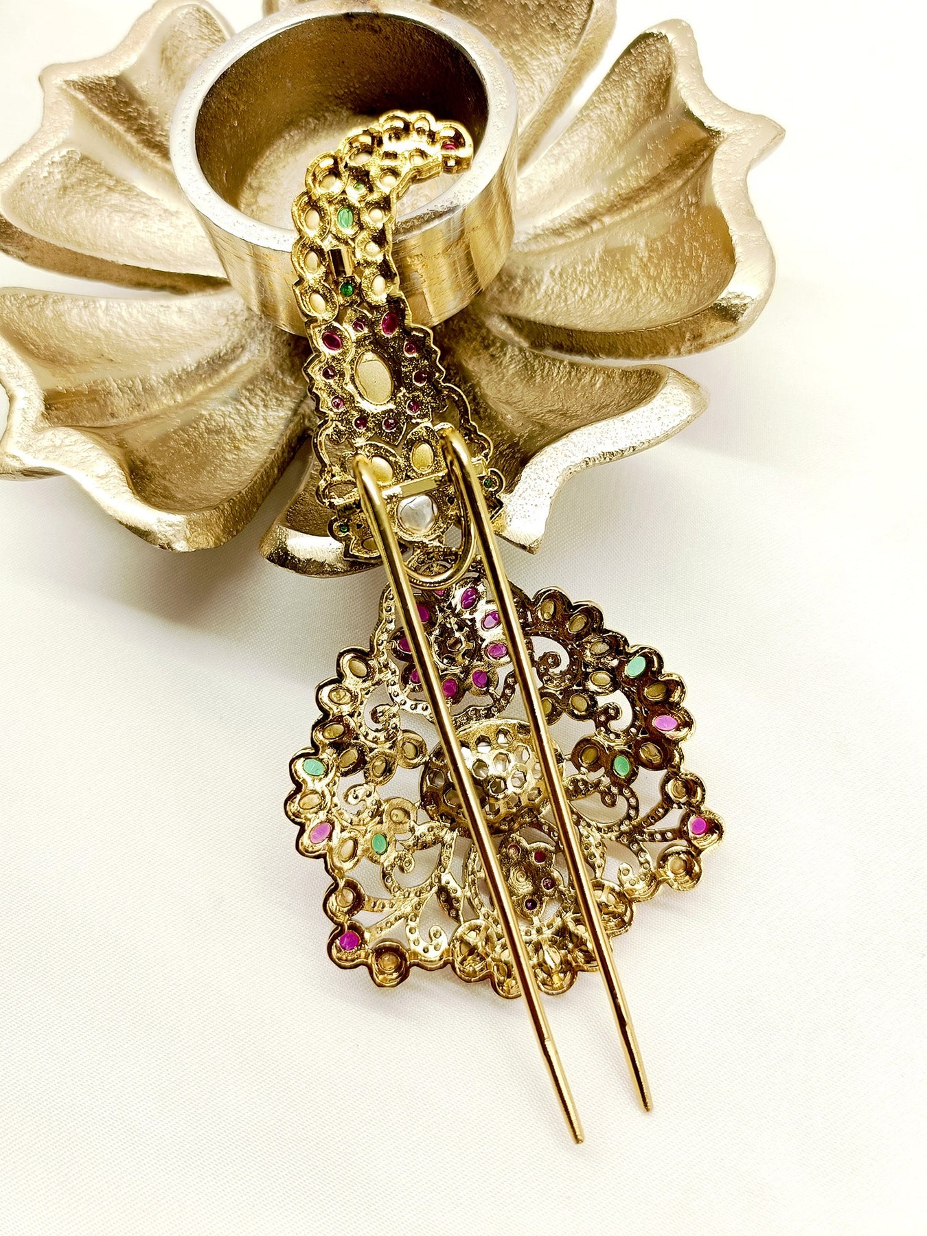 Enhance Your Wedding Attire With Our Kundan Dulha Kalgi. Made With Gold Plated Brass Metal And Exquisite Kundan Work, It Features A Stunning American Diamond Setting And Elegant Pearl Hanging. Elevate Your Look With This Traditional And Timeless Accessory.