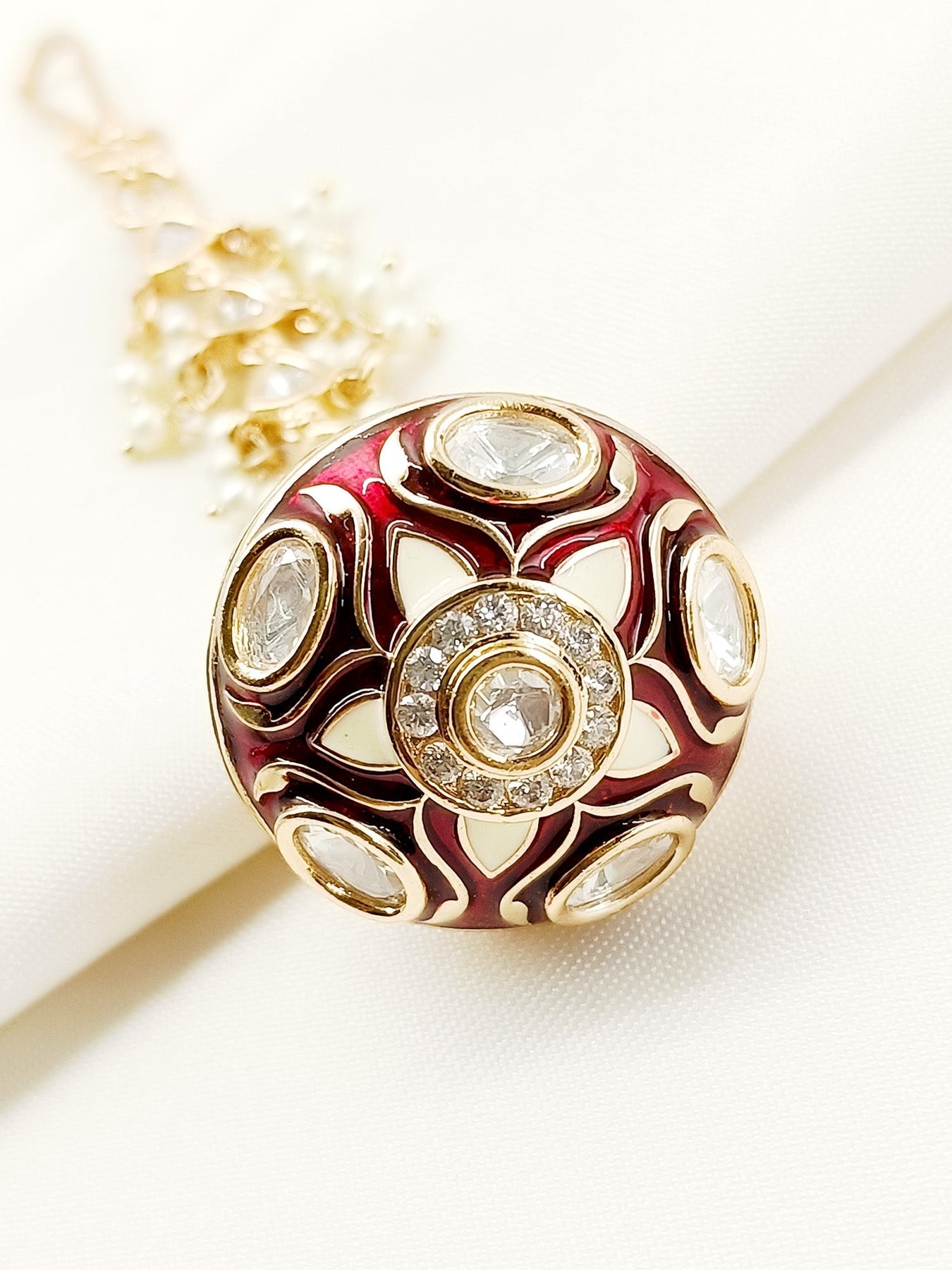 Experience The Timeless Beauty Of Our Maroon Kundan Borla. Crafted From Gold-plated Brass Metal, This Traditional Headpiece Features Stunning American Diamond And Semi-precious Stones. Elevate Your Outfit And Embrace Indian Heritage With This Exquisite Piece.