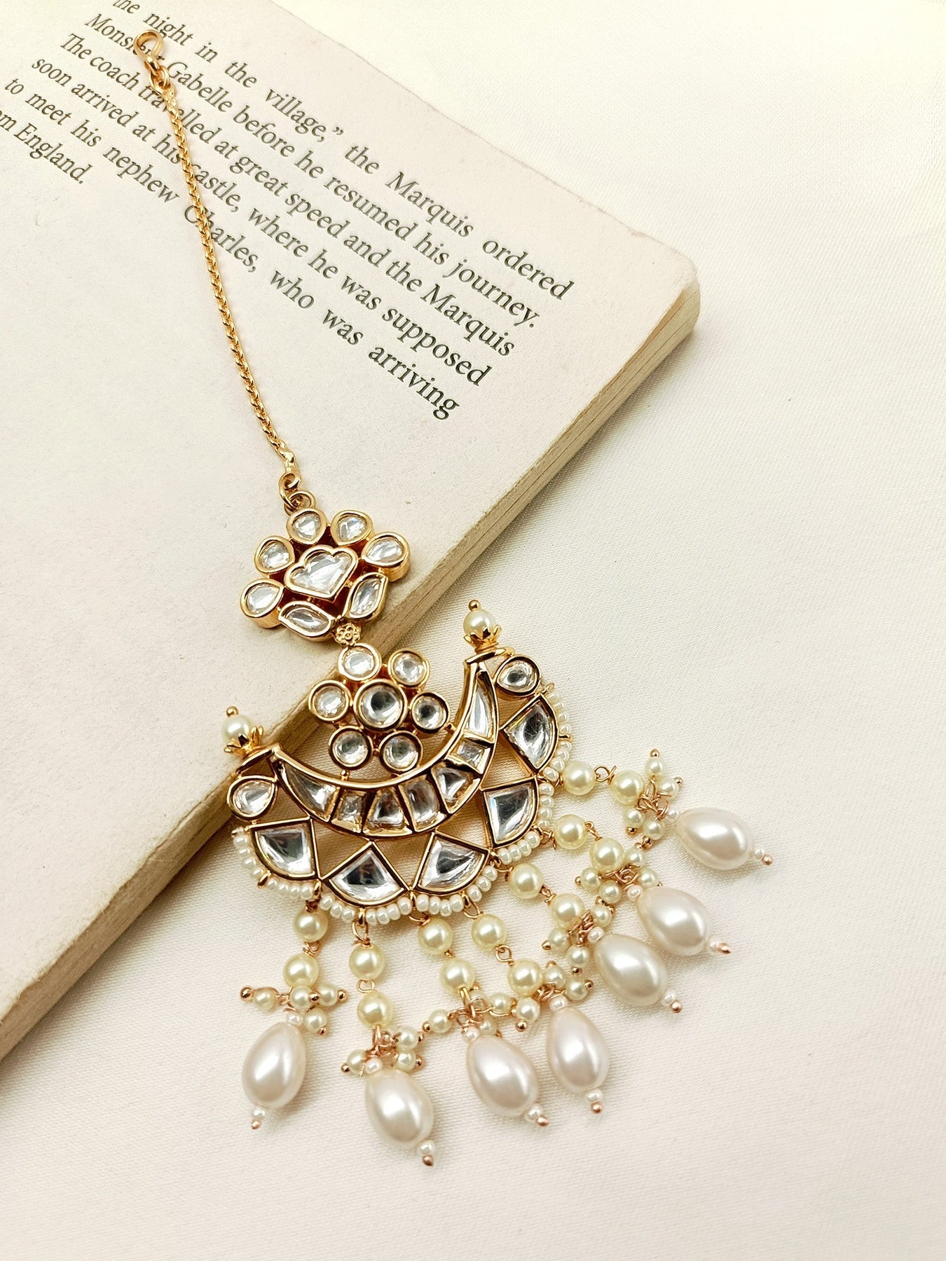 Expertly Crafted With Traditional Kundan Design, This Maangteeka Is Made Of Gold Plated Brass Metal And Features Intricate Pearl Hanging. Add A Touch Of Elegance And Tradition To Any Outfit With This Beautiful Piece.