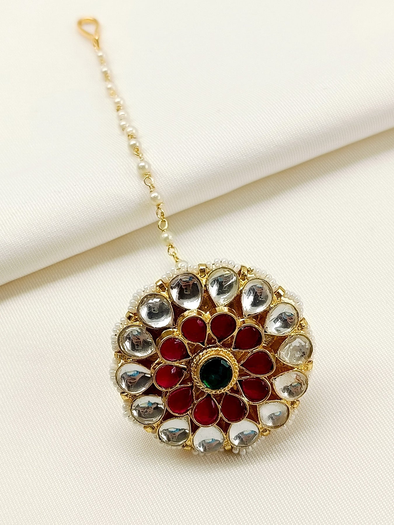 This Traditional R&G Kundan Borla Is Crafted With Gold Plating Brass Metal And Adorned With Pearls And Semi Precious Stones. Handmade With Precision, This Borla Adds A Touch Of Elegance And Charm To Any Traditional Indian Outfit. Made From Quality Materials, It Is A Timeless Piece Of Jewelry For Any Occasion.
