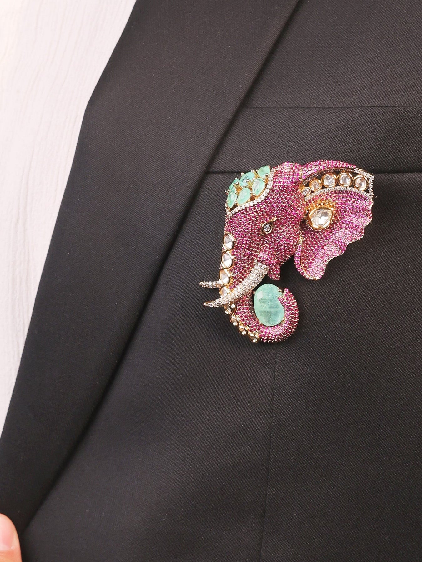 Elegant Ruby Elephant Brooch Crafted In Antique Gold-plated Brass, Adorned With Sparkling American Diamonds And Semi-precious Kundan Stones. This Timeless Piece Combines Traditional Craftsmanship With Sophisticated Design, Perfect For Adding A Touch Of Grace To Any Occasion. The Intricate Detailing And Rich Color Palette Make It An Ideal Accessory For Festive Celebrations Or Everyday Elegance. A Versatile Statement Piece That Complements Both Traditional And Contemporary Wardrobes.