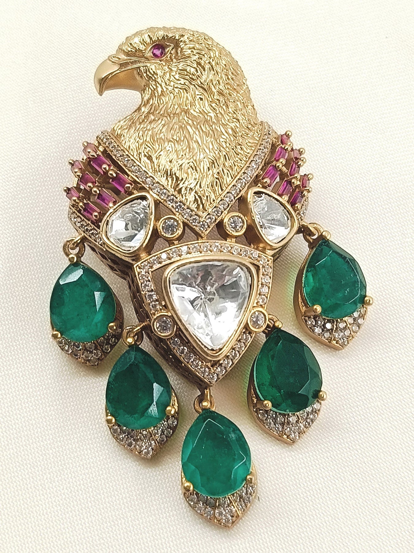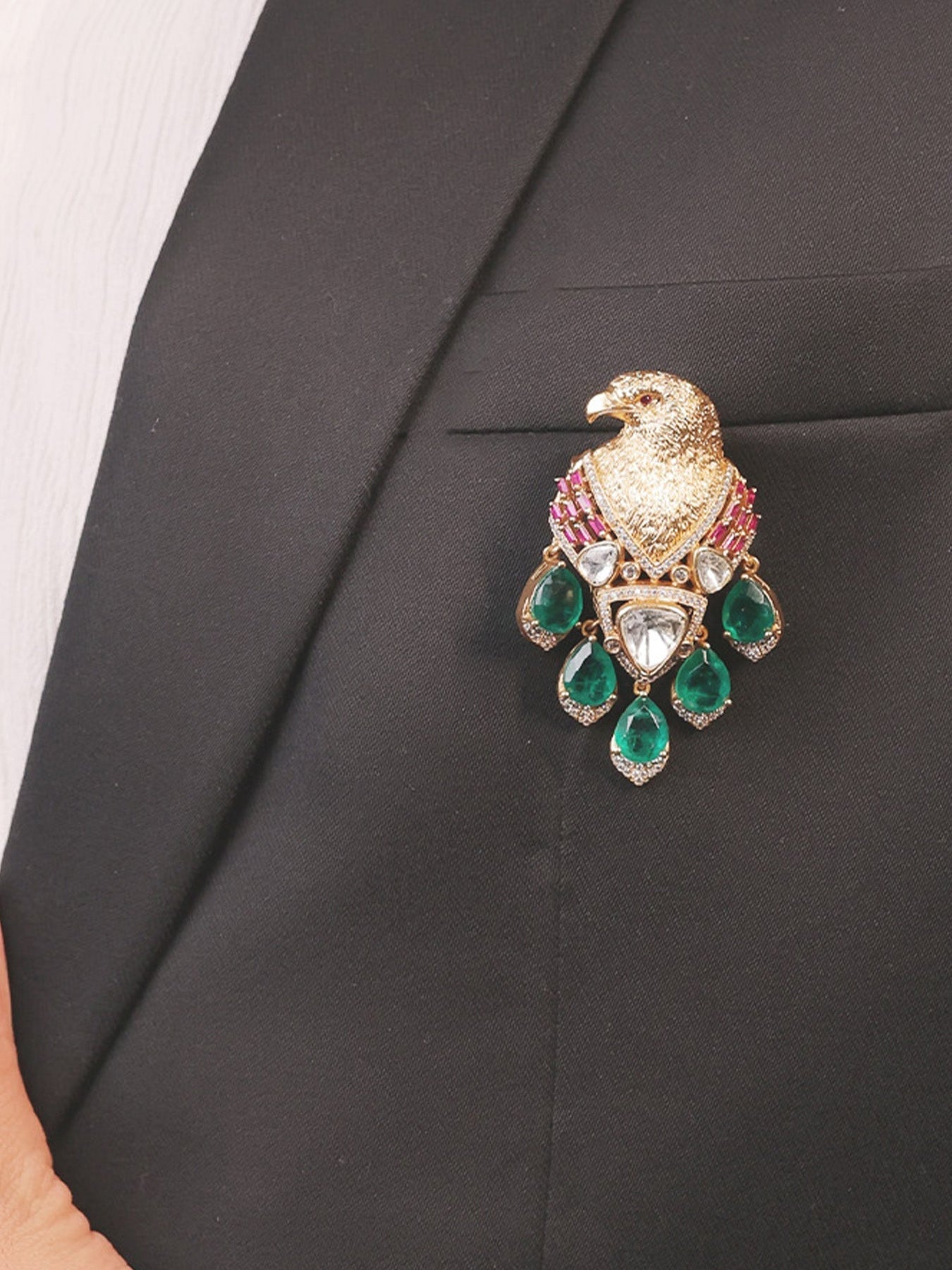 Elevate Your Accessory Collection With This Striking Green Eagle Brooch, A Masterpiece Of Vintage-inspired Design. Crafted From Antique Gold-plated Brass, This Brooch Features A Majestic Eagle Motif Adorned With Sparkling American Diamonds And Rich Emerald Stones. The Combination Of Precious And Semi-precious Elements Creates A Sophisticated Aesthetic Perfect For Formal Occasions Or Adding Timeless Elegance To Everyday Wear. The Secure Brooch Clasp Ensures Reliable Fastening, While The Intricate Detailing Showcases Exceptional Craftsmanship. An Ideal Statement Piece For Collectors And Those Seeking Distinctive, Heirloom-quality Jewelry.