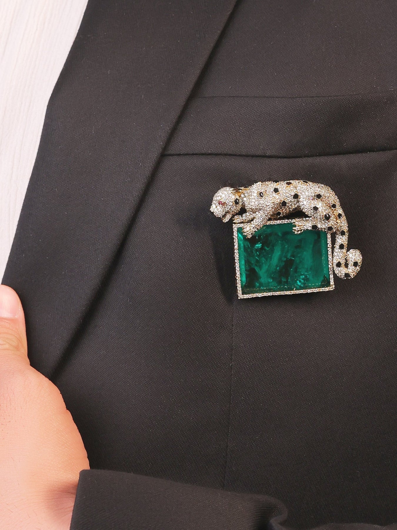 This Green Leopard Brooch Features Antique Gold-plated Brass Metal, Combining Vintage Appeal With Durable Craftsmanship. Adorned With Sparkling American Diamonds And A Striking Doublet Stone Centerpiece, It Offers A Sophisticated Touch To Any Outfit. Perfect For Adding An Elegant, Timeless Accent To Your Collection.