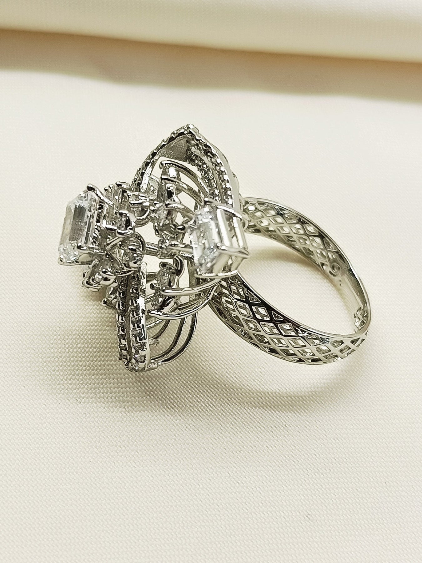 The Finger Ring Features 92.5% Pure Silver With A Silver-plated Brass Base, Combining Strength And Elegance. Adorned With Carefully Set American Diamonds, It Delivers A Sophisticated Sparkle That Enhances Any Ensemble. This Expertly Crafted Ring Balances Durability With Refined Style, Making It An Excellent Choice For Everyday Wear Or Special Occasions.