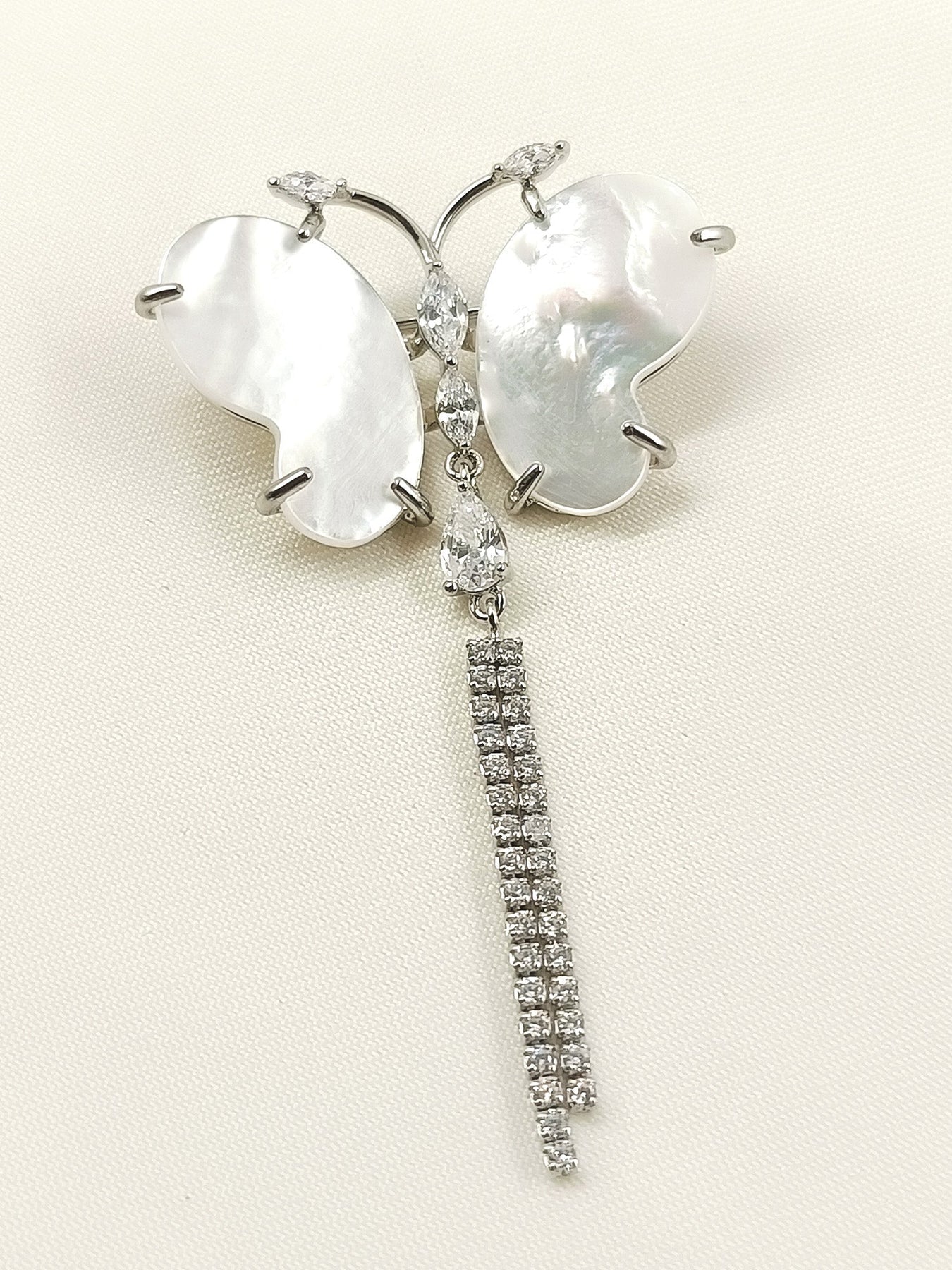 Elevate Your Accessory Collection With This Exquisite White Butterfly Brooch, A Masterpiece Of Refined Craftsmanship. Meticulously Crafted From Silver-plated Brass, This Brooch Features A Stunning Combination Of Sparkling American Diamonds And Carefully Selected Semi-precious Stones, Complemented By Lustrous Mother-of-pearl Accents. The Delicate Butterfly Design Captures Timeless Elegance, Making It An Ideal Choice For Both Everyday Sophistication And Special Occasions. Perfect For Pinning To Lapels, Scarves, Or Evening Wear, This Brooch Seamlessly Blends Artisanal Quality With Contemporary Style.