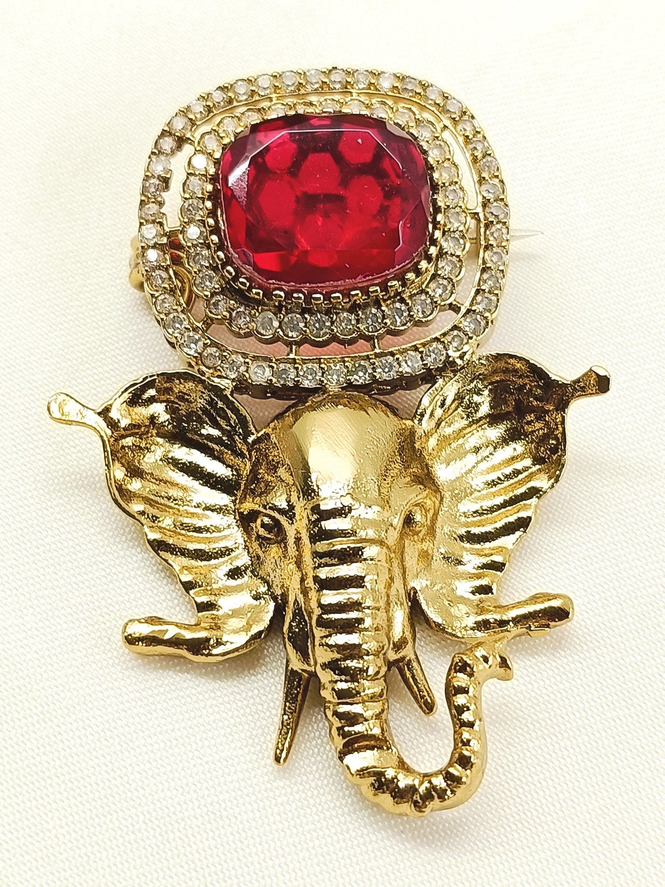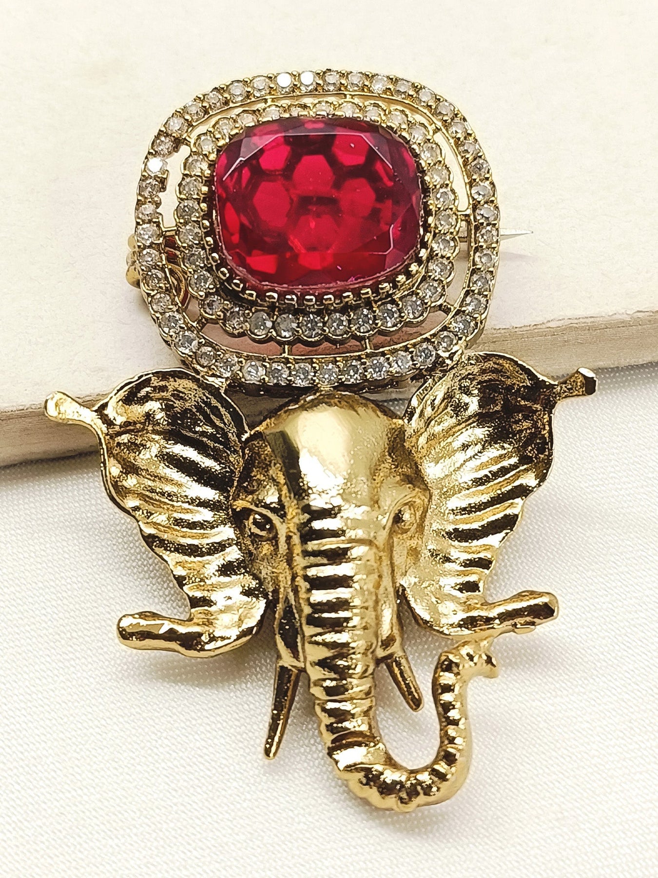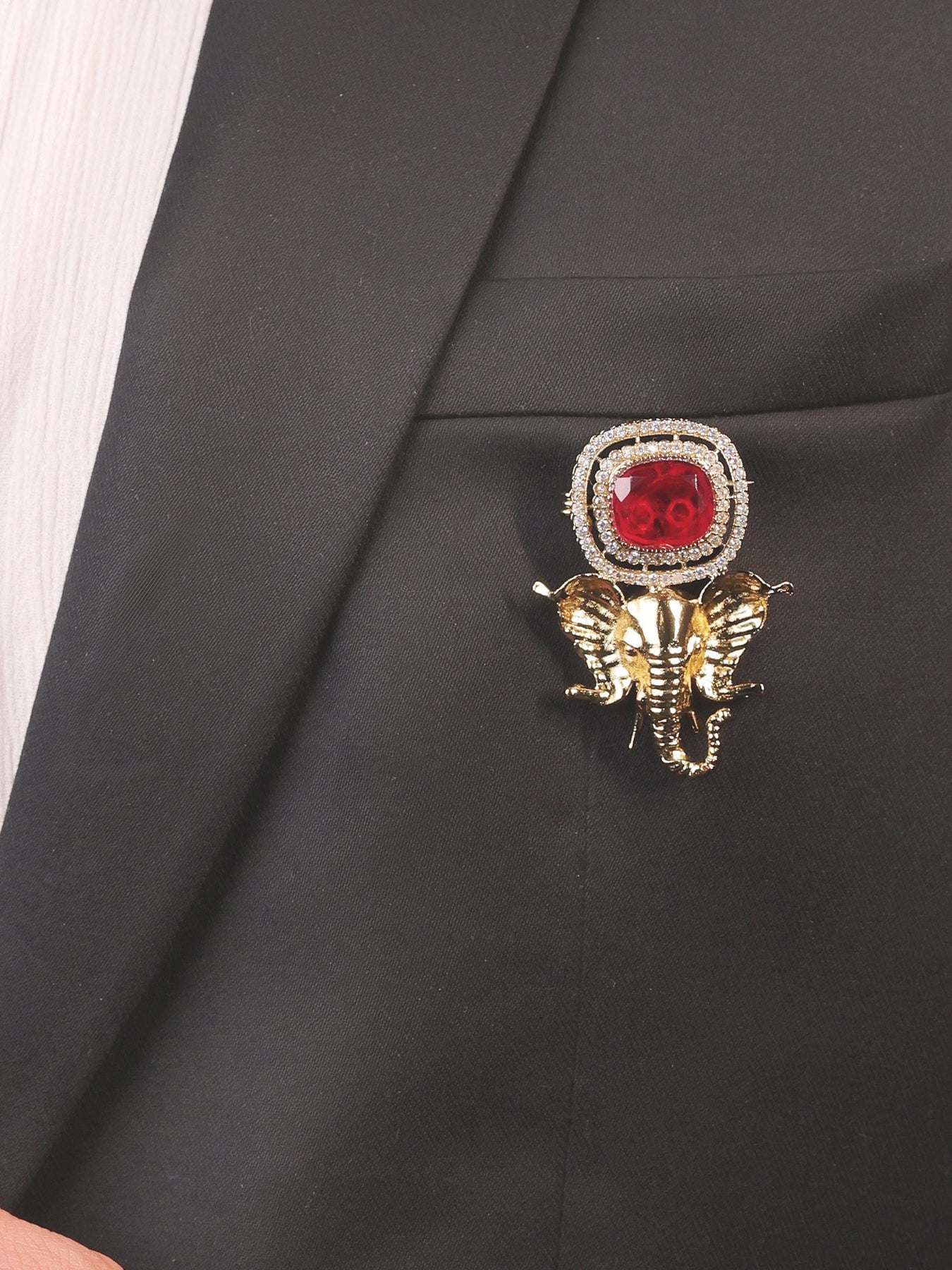 Elevate Your Spiritual Adornment With This Exquisite Ruby Ganesh Ji Brooch, Meticulously Crafted From Antique Gold-plated Brass. Featuring Lustrous Moissanite Stones And Brilliant American Diamonds, This Piece Combines Traditional Iconography With Contemporary Elegance. The Warm, Vintage-inspired Gold Finish Enhances The Divine Symbolism While The Premium Stone Setting Ensures Lasting Radiance. Perfect For Devotional Wear Or As A Meaningful Accessory That Celebrates Faith And Refined Craftsmanship.
