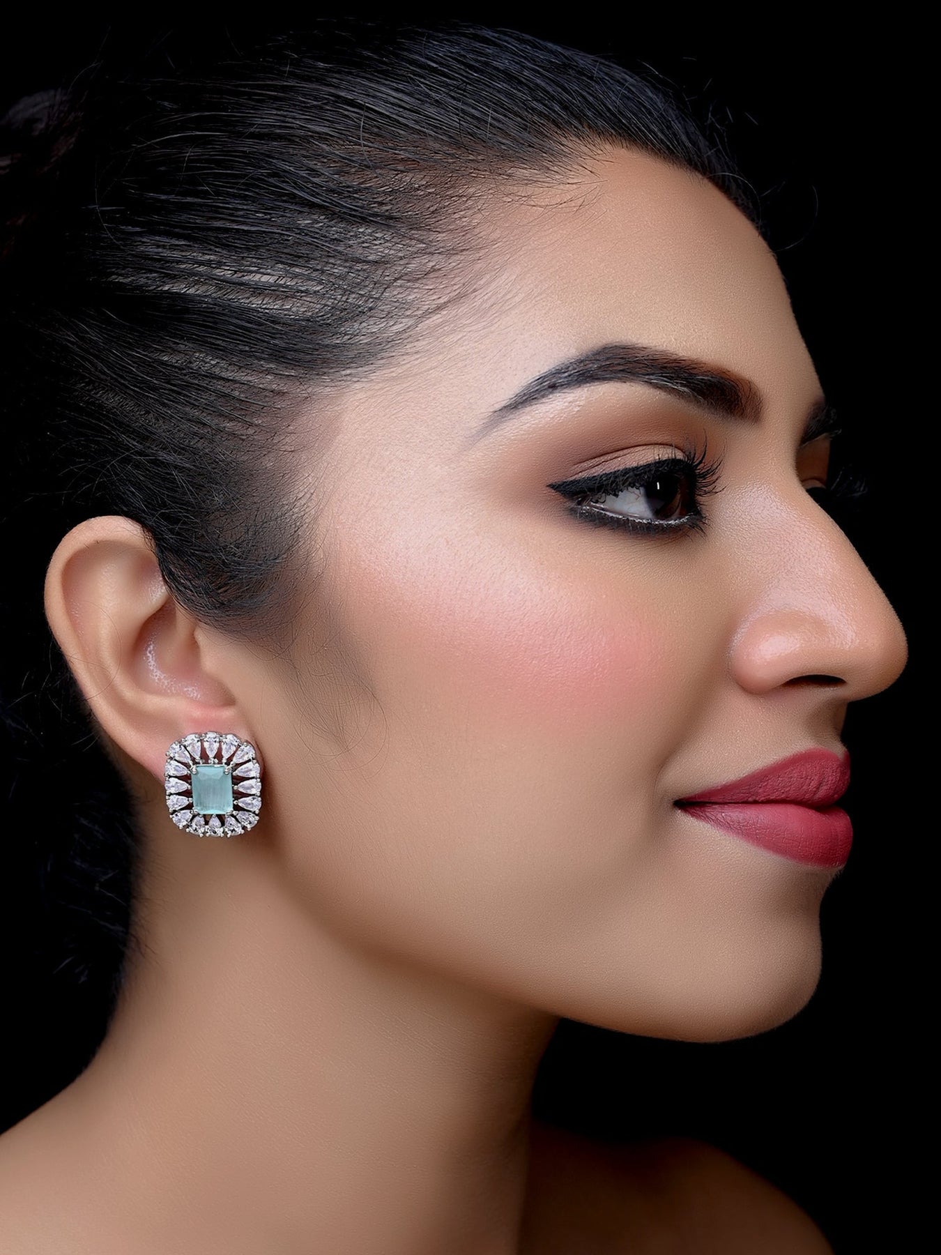 Trendy American Diamond Tops (studs) With Semi Precious Mint Green (aqua) Stone. Brass Metal Silver Plated