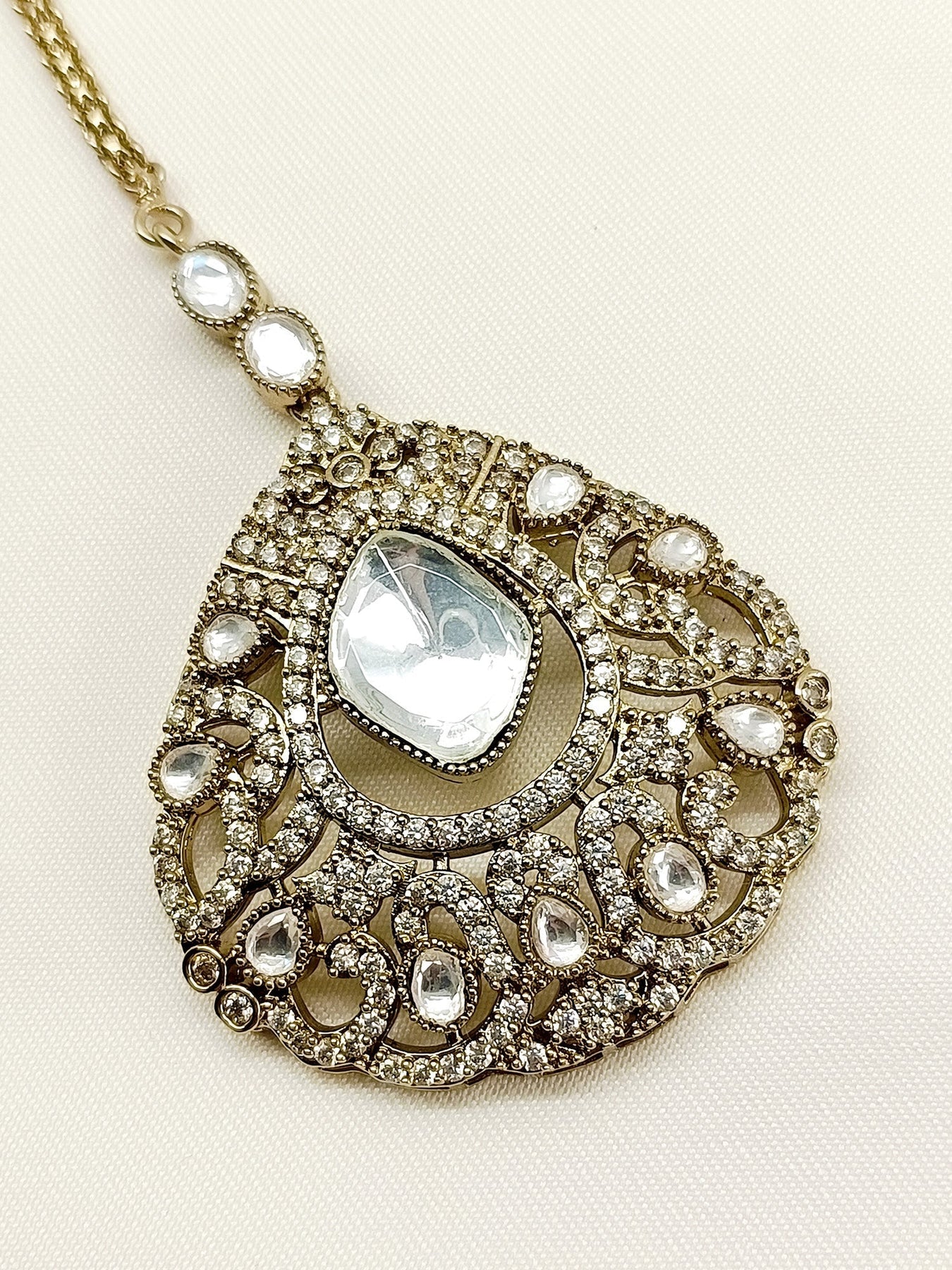 Introducing The White Victorian Teeka, An Elegant Piece That Exudes Vintage Charm. Featuring Stunning Antique Gold Plating, This Teeka Is Adorned With American Diamonds And Semi Precious Stones For A Touch Of Sparkle. Elevate Any Look With This Delicate And Timeless Accessory.