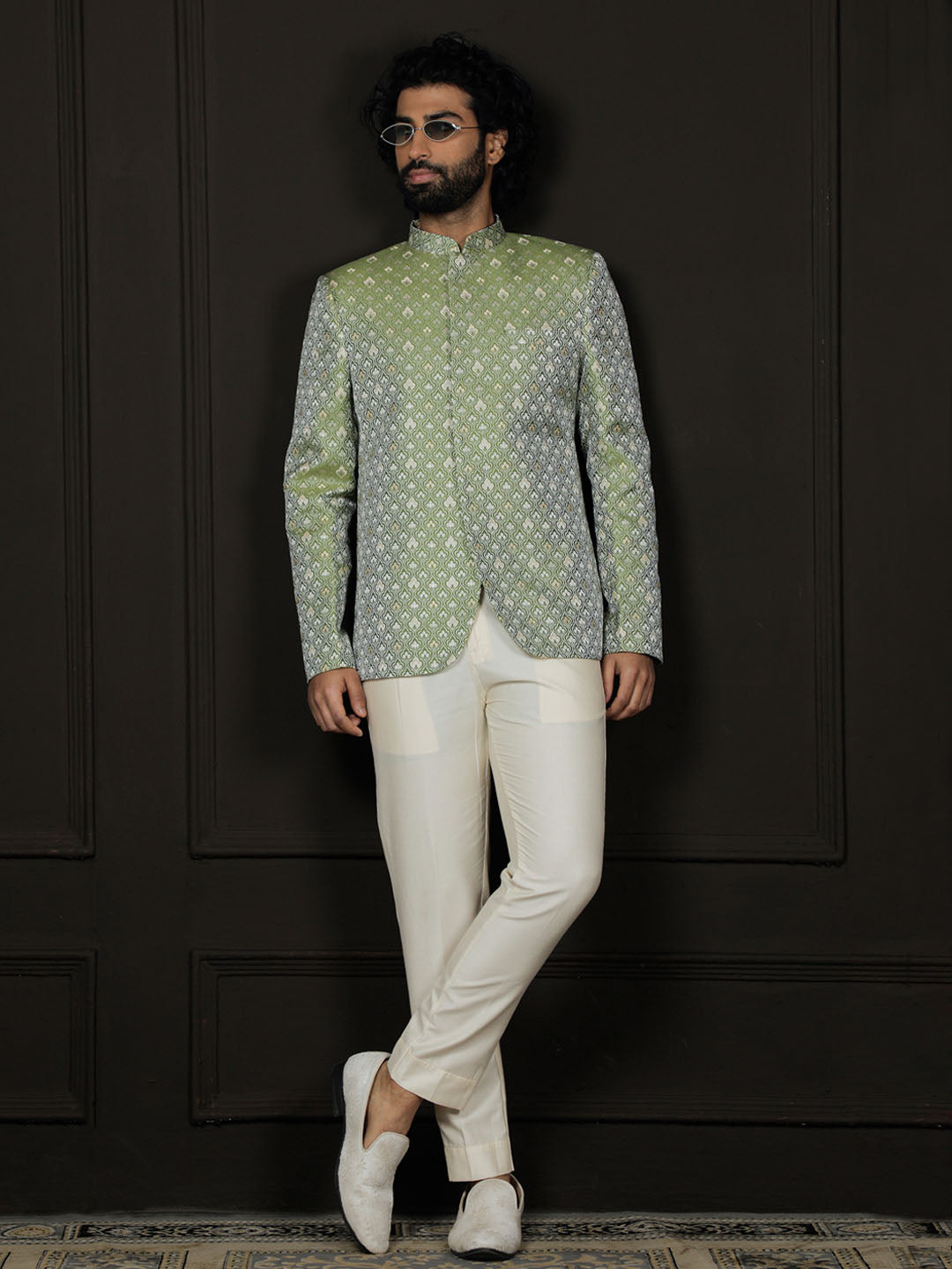 Add regal charm to your wardrobe with this Sarvati Jacquard Jodhpuri. Style it with tailored trousers, a juti, or a mojari to complete your wedding or festive ensemble.