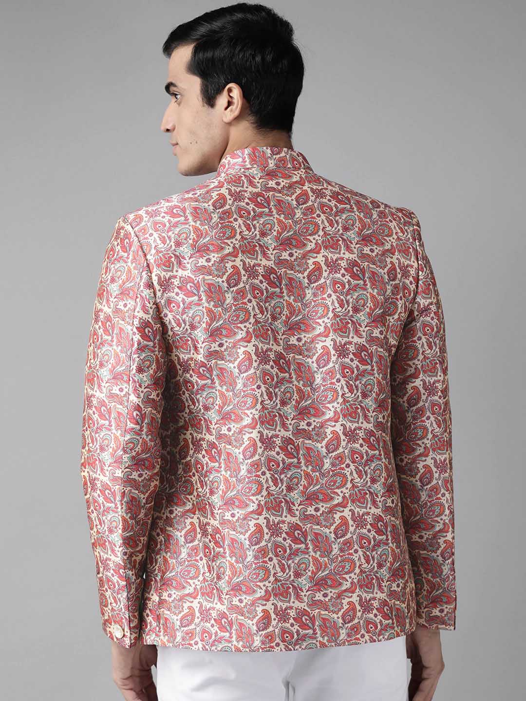 Multicolor base with pink floral printed Jodhpuri featuring a mandarin collar, long sleeves, button closure, single pocket, and attached lining.