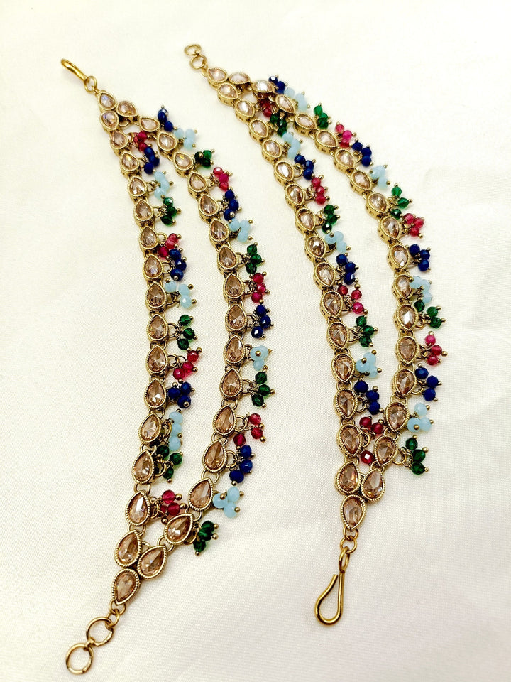 Traditional Beautifully Designed Silver Plated Brass Metal Double Layerd Kaan Chain For Ears To Give Complete Ethnic Look With Pearl Hanging And Polki Stones.