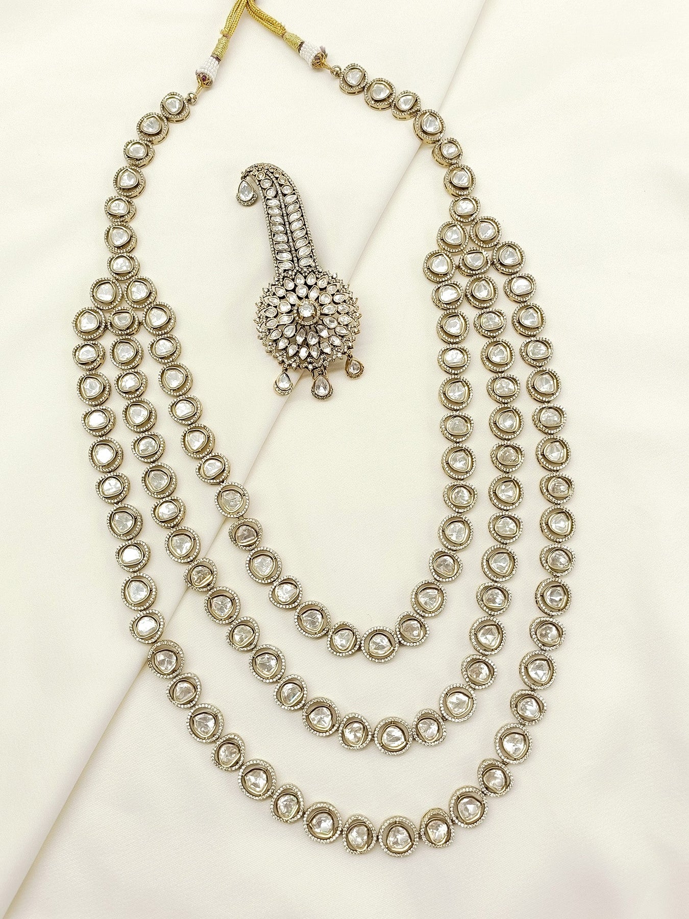 Elevate Your Wedding Ensemble With This Traditional Groom Mala And Kalgi Set In Pristine White. Crafted With Antique Gold Plating And Adorned With American Diamonds And Semi-precious Stones, This Exquisite Combination Offers The Perfect Balance Of Heritage And Luxury. Each Piece Is Meticulously Designed To Complement Traditional Wedding Attire, Ensuring The Groom Makes A Distinguished Statement On His Special Day.