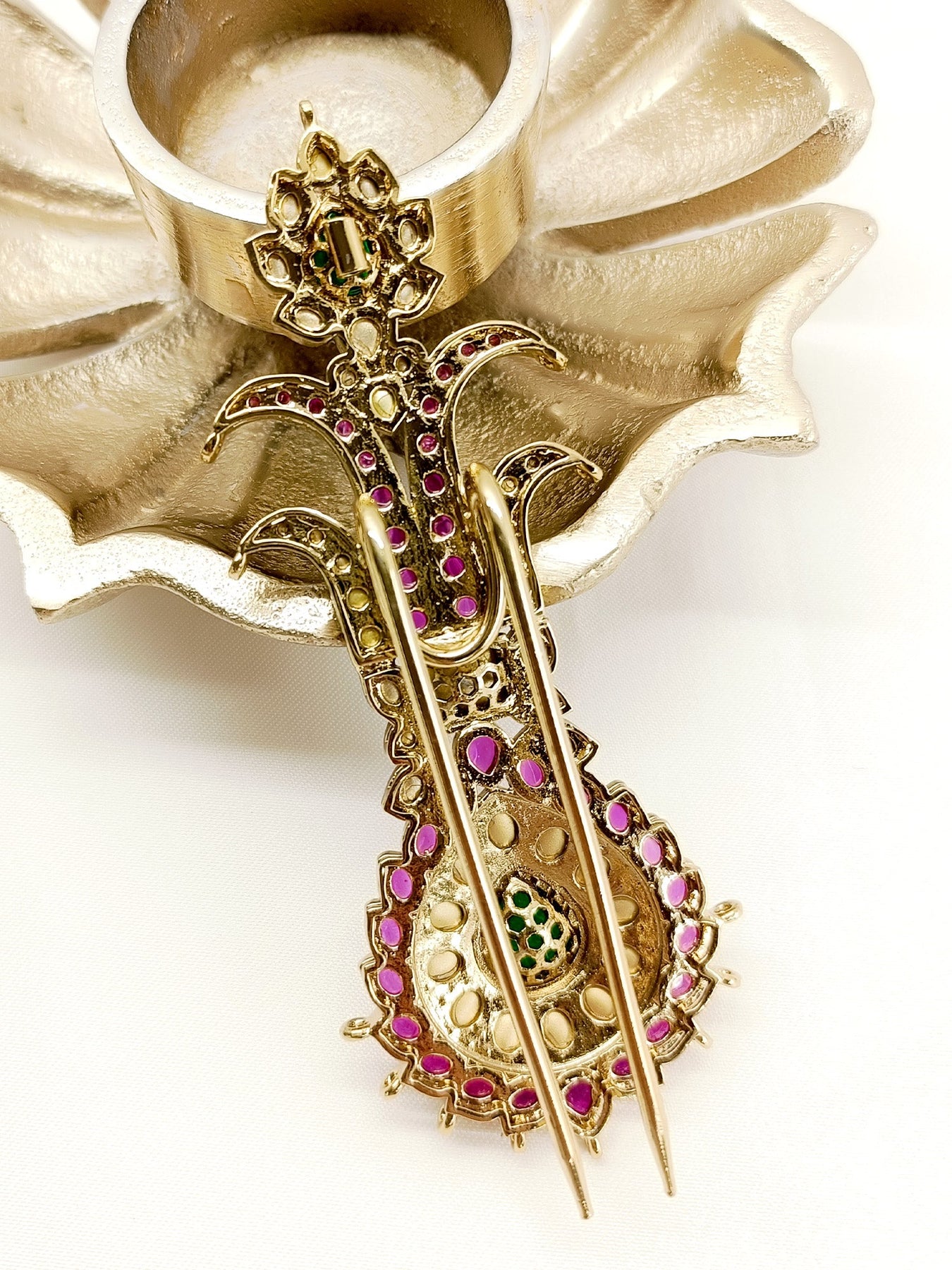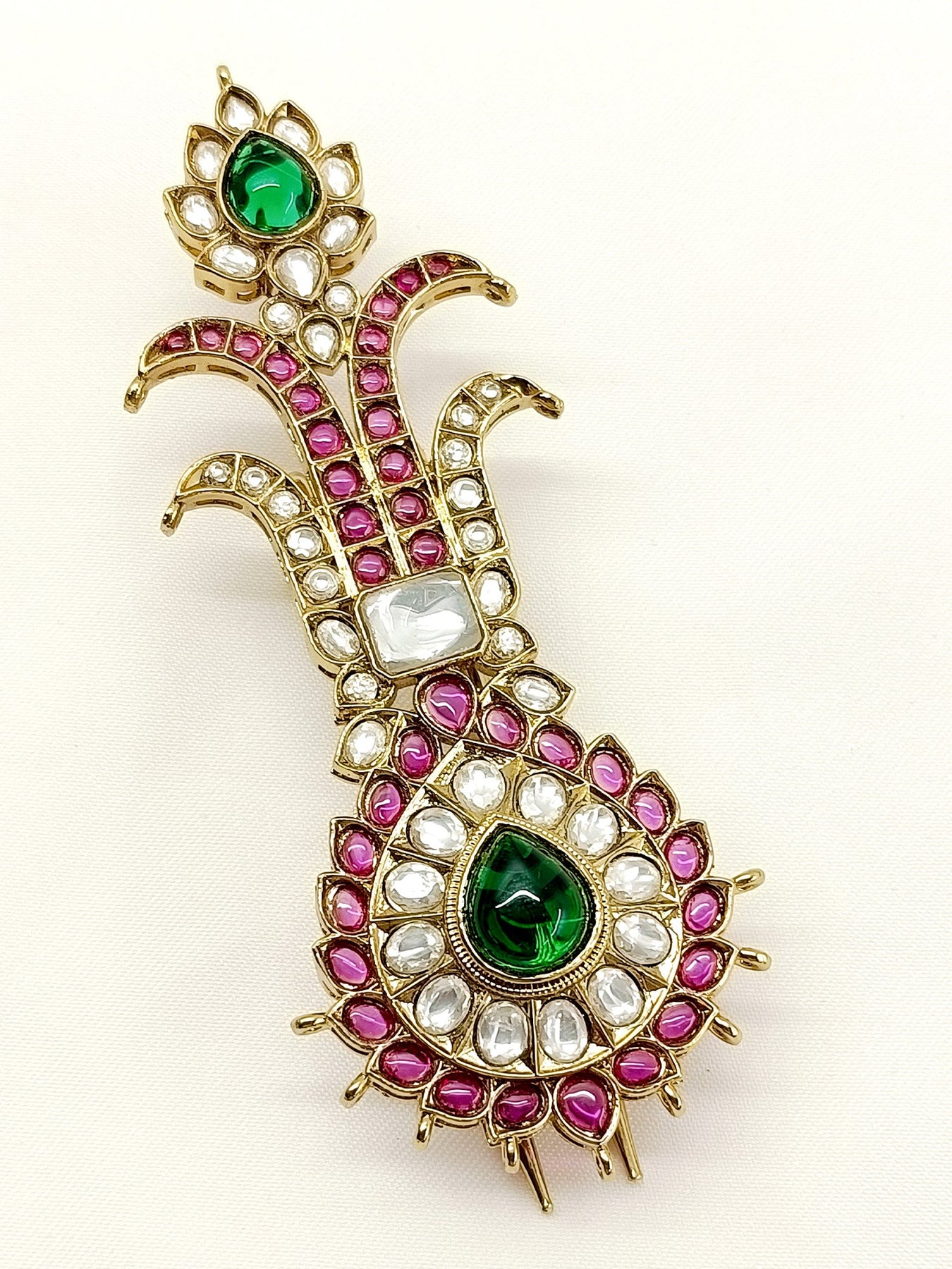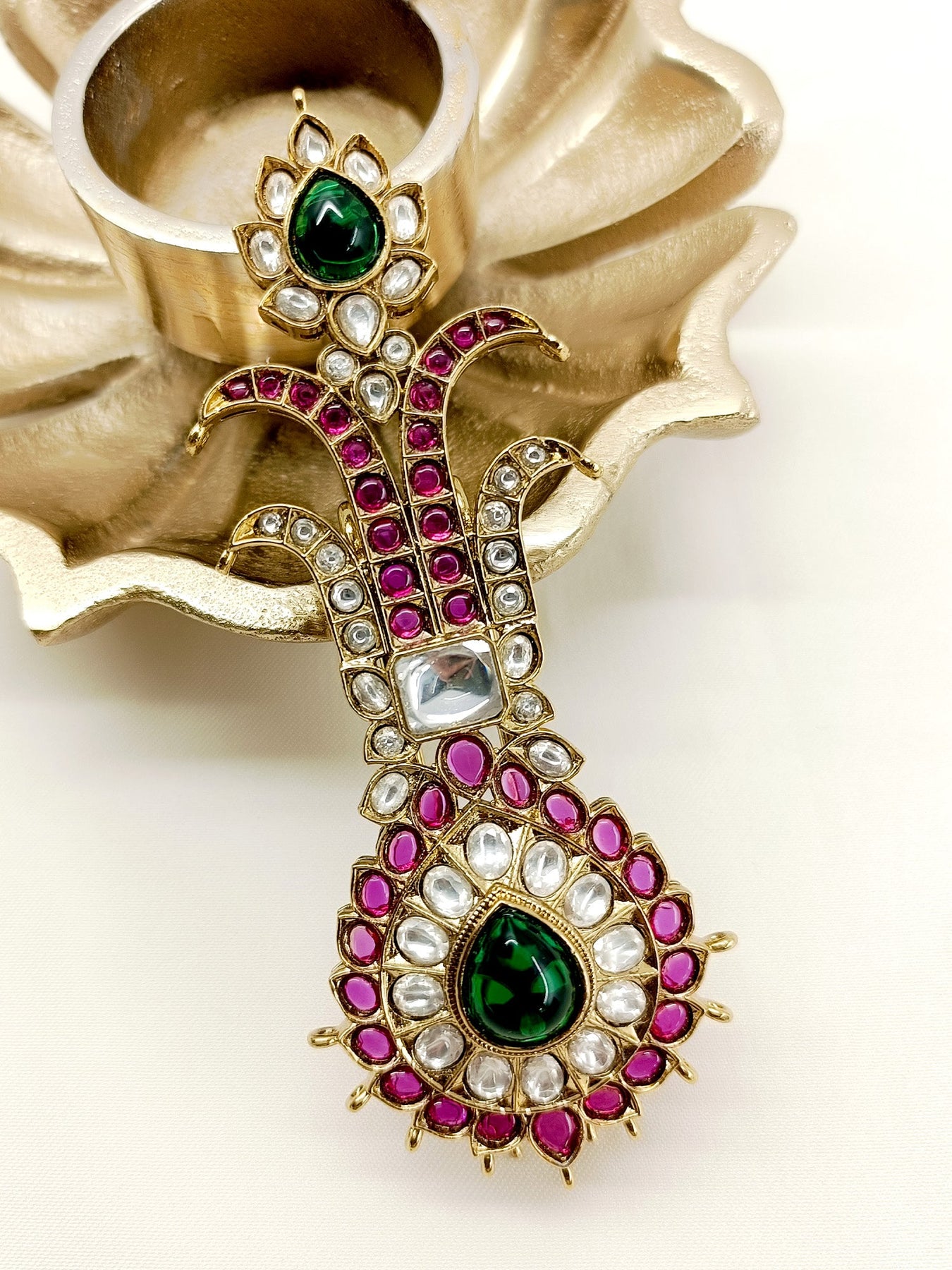 Enhance Your Wedding Look With The M & G Dulha Kalgi. This Exquisite Piece Features An Antique Gold Plating And Intricate Kundan Work With Stunning Green And Ruby Semi Precious Stones. Elevate Your Groom's Attire With This Elegant And Traditional Kalgi.