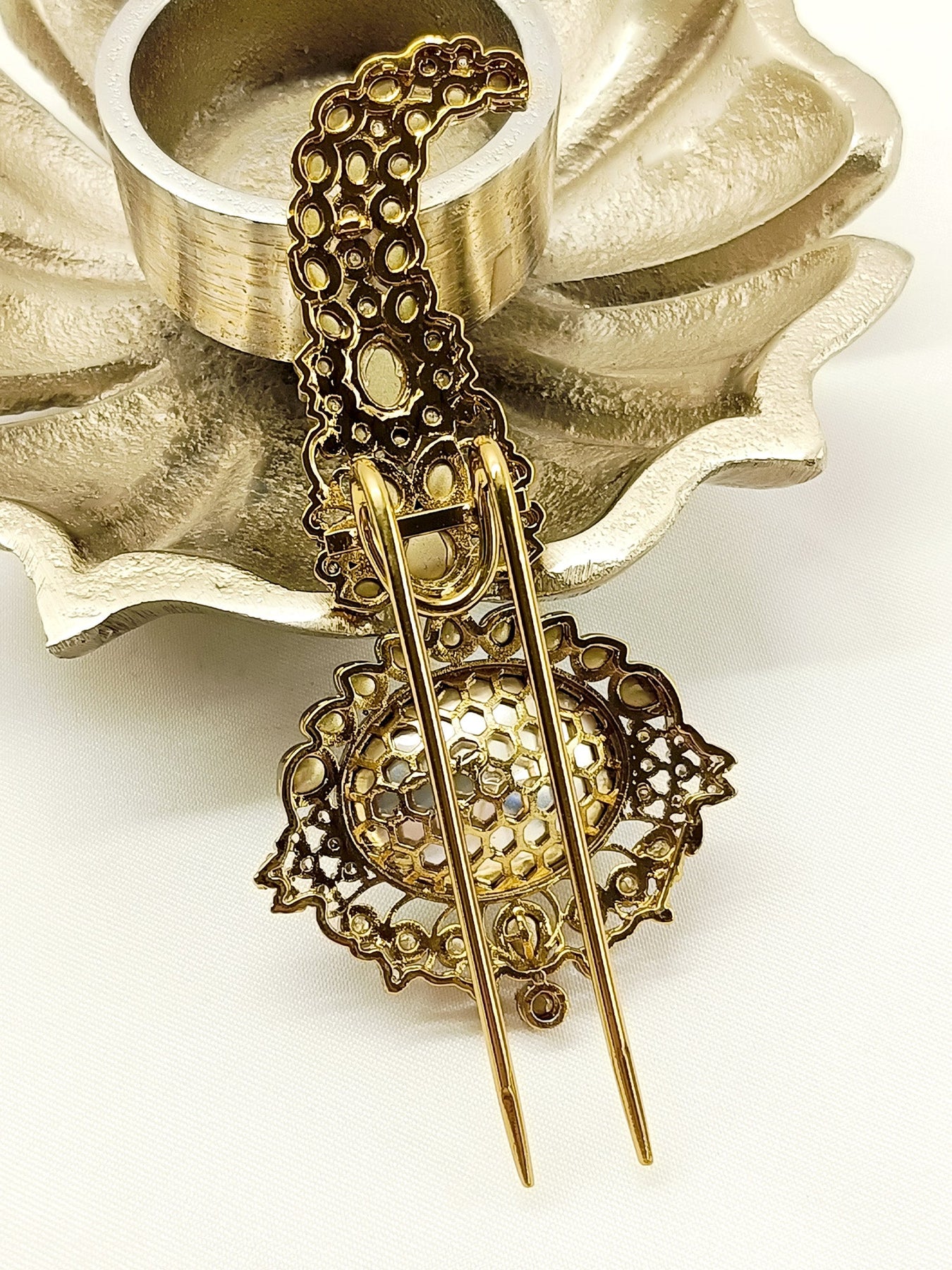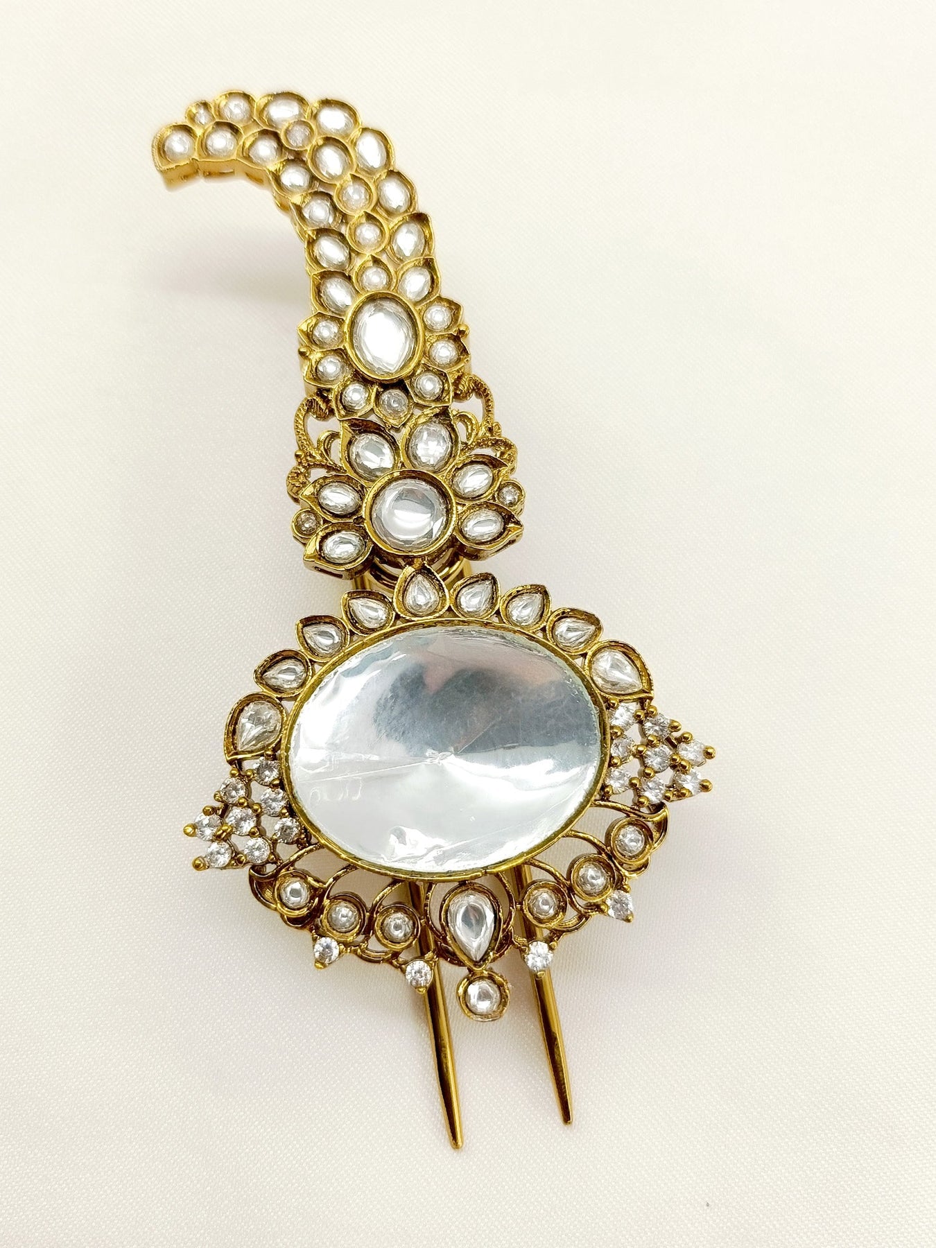 This Traditional Dulha Kalgi Is Beautifully Designed With Antique Gold Plating And Features Eye-catching American Diamonds. The Fusion Of Mossonite And Kundan Adds A Touch Of Elegance To This Accessory. Perfect For Grooms Looking To Add A Timeless And Sophisticated Touch To Their Wedding Attire.