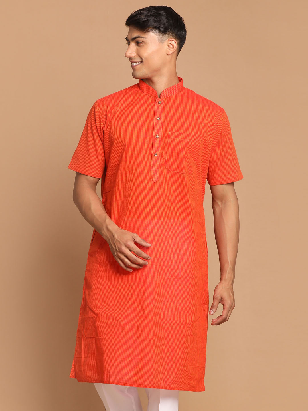 Brighten your wardrobe with Sarvati’s orange striped handloom kurta crafted from pure cotton. Designed with a mandarin collar, button placket, short sleeves, knee-length cut, and side slits for comfort and easy movement. Ideal for casual gatherings, festive occasions, and summer events.