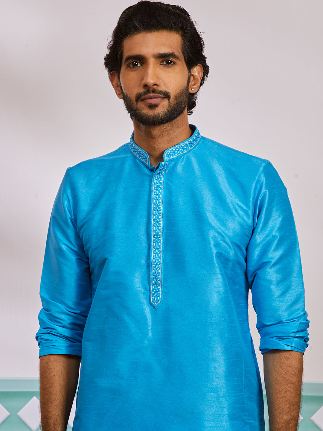 This men's solid kurta, adding a touch of sophistication to traditional wear. The kurta is adorned with a embroidered collar patti, enhancing its refined appeal. making it a perfect choice for festive occasions, celebrations, and cultural events.